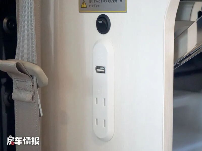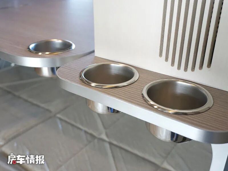 从两侧进入车内后,可以看到一个简单的会客区,空间不是很大,但是依旧可以满足3、4个人的交谈空间。这里既有放置水杯的凹槽也有多个充电接口,方便大家使用。