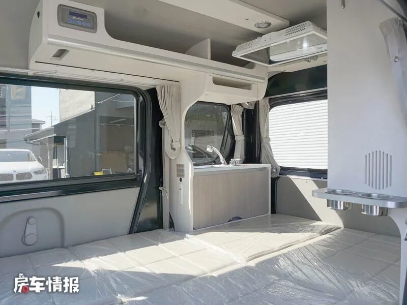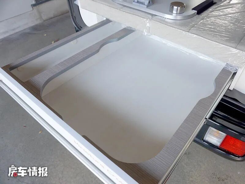 车尾是本车的厨房区,右侧装有水龙头、不锈钢洗手池以及储物柜,右侧装有一个12V微波炉,方便在户外加热饭菜,但是车内没有炉灶,需要自带便携式卡炉,建议您在户外炒菜,这样也可以避免污染到车内的环境。两侧还各有一个可折叠的小桌板,抬起后可以当做餐桌使用,十分方便。