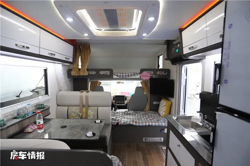 生活区内设计与其它房车较为不同,由前到后依次为额头床、单人床、会客区、厨房区、卫生间以及纵置床,可以看到在本车驾驶室后还有一张床,在利用了车内空间的同时也多提供了一个床位。