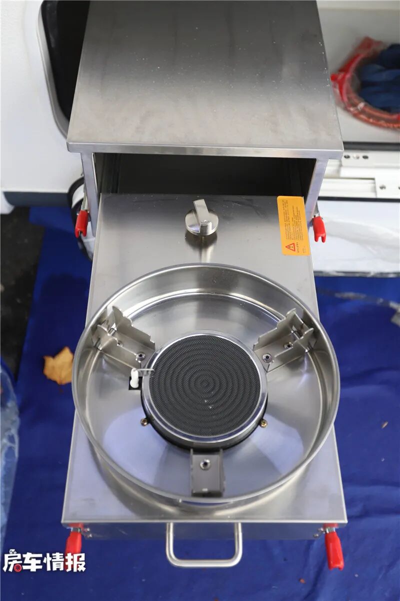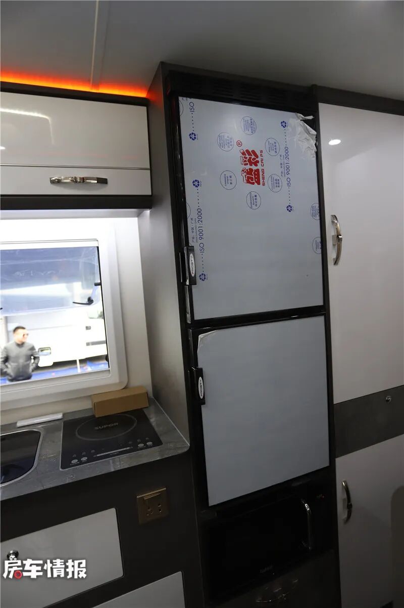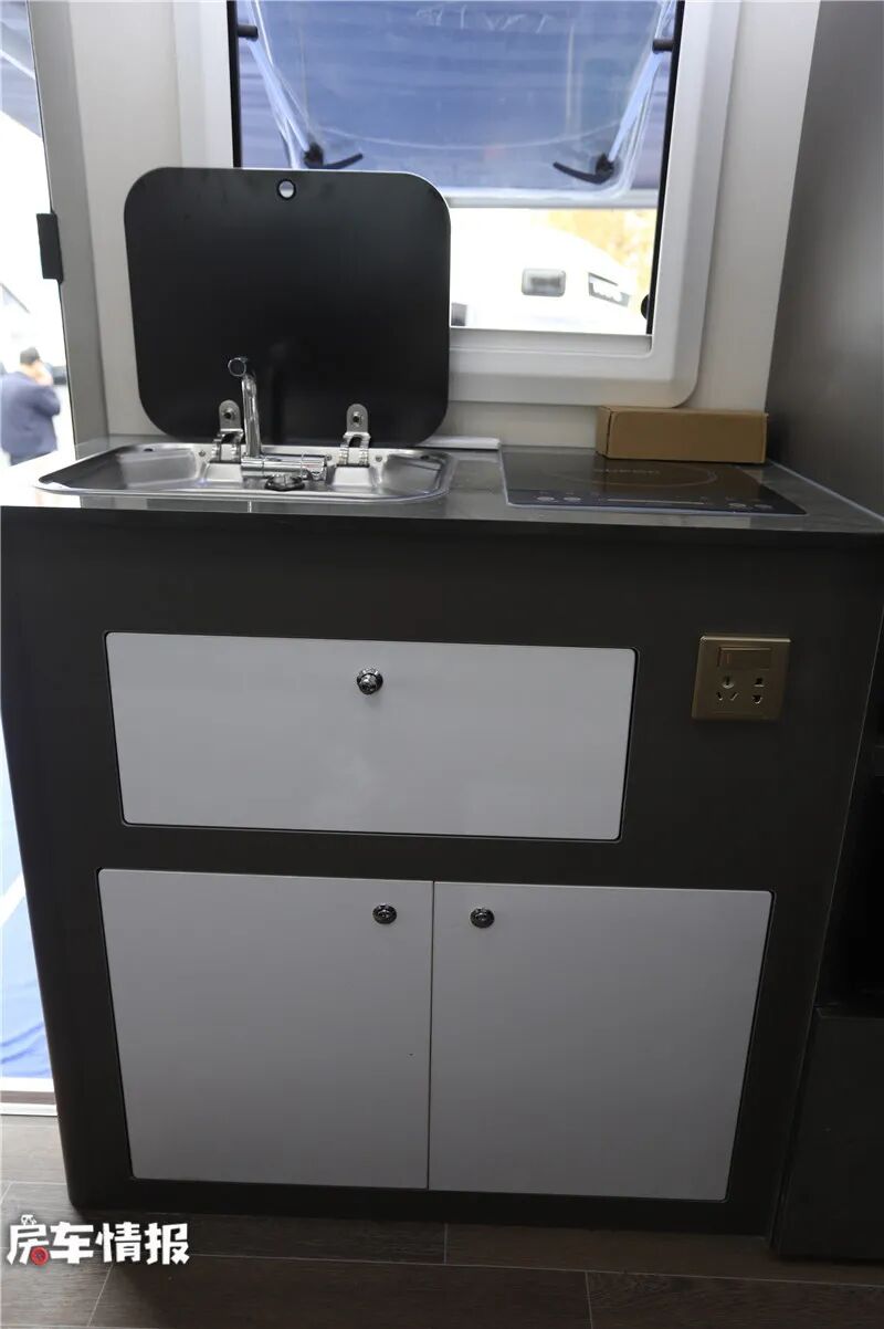 厨房在车门左侧,装有家用电磁炉、掀盖式的水槽和水龙头、电源插座和储物柜,旁边还有一个24V148L房车专用双开门冰箱,可以保存出行的食材,随时享受烹饪的乐趣。安全起见,还装有一个烟雾报警器,防止危险的发生。