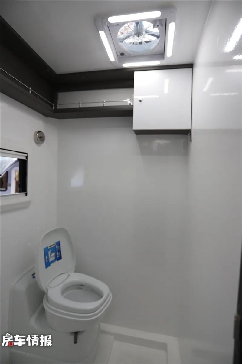 卫生间位于车尾右侧,采用一体式设计,空间很大,装有赛特福德抽拉式马桶、一体式豪华淋浴花洒、加大浴帘、换气扇、储物柜等设备,不用为空间小以及设备不全需要自行携带而烦恼了。