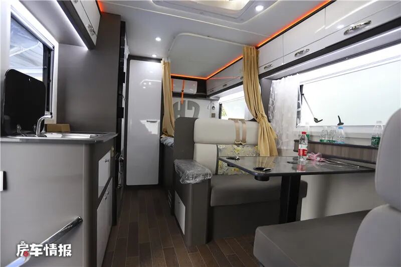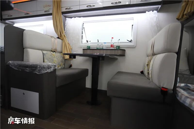 会客区在车门对面,由一张可升降餐桌和对坐式卡座沙发组成,座椅都配有安全带,保证了行车时的安全,餐桌上还有旁边的小台子上都有放置水杯或物品的凹槽,可以避免物品的掉落。右前方有一台27寸2k显示器和小米电视盒,在车内也可以享受娱乐的时光。顶部还装有储物吊柜、24V LED组合大顶灯和换气扇。在需要休息的时候,餐桌和沙发还能变成一张双人床供家人朋友们睡觉休息。