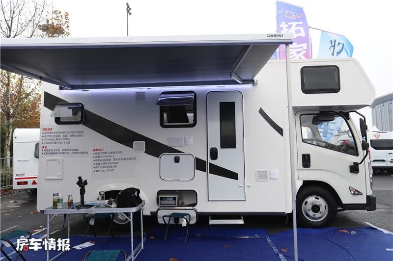 车身外侧装有3.5米遮阳棚、户外抽拉灶台、电源插座、外置淋浴、水电接口以及多个储物仓,方便了车内车外的户外生活。