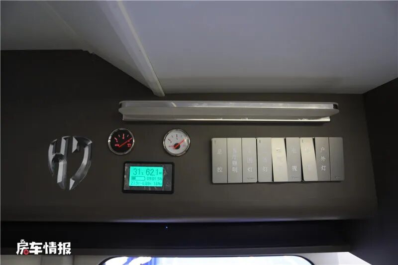 水电方面,本车配备了320L的加大净水箱、60L灰水箱以及200Ah胶体电池、3000W逆变器,同时还有一个200W的太阳能电池板,可以持续为车内供电。车内装有燃油加热器及暖风一体机提供暖风和热水。还有过载控制保护器、MPPT太阳能控制器等设施保证用水用电的安全。