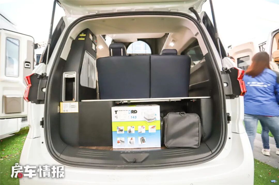 夜晚休息的时候可以把四张座椅放平,拼接成一张尺寸达到了2200*1100mm的双人床,睡下2名成年人还是没有问题的;如果平常出行人数达到4人的话,还可以选装一个电动车顶帐篷,内部还可以增加一张尺寸约为2100*1100mm的双人床,并且选装车顶帐篷后,在驻车以后还可以增加驻车车内垂直高度。