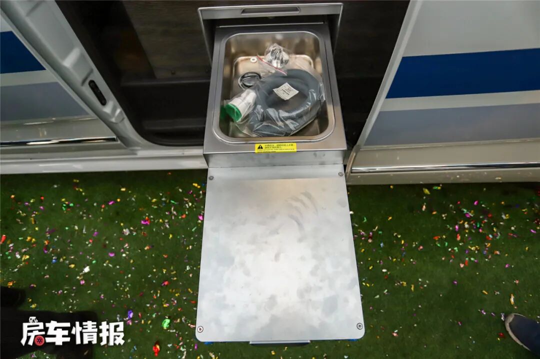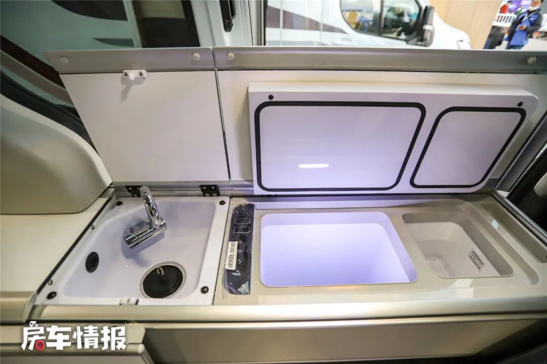 位于车厢内侧还提供了储物柜、洗手池以及一台车载冰箱在,这款车上还提供了60L清水箱和20L灰水箱,基本上能够满足日常洗手洗脸。