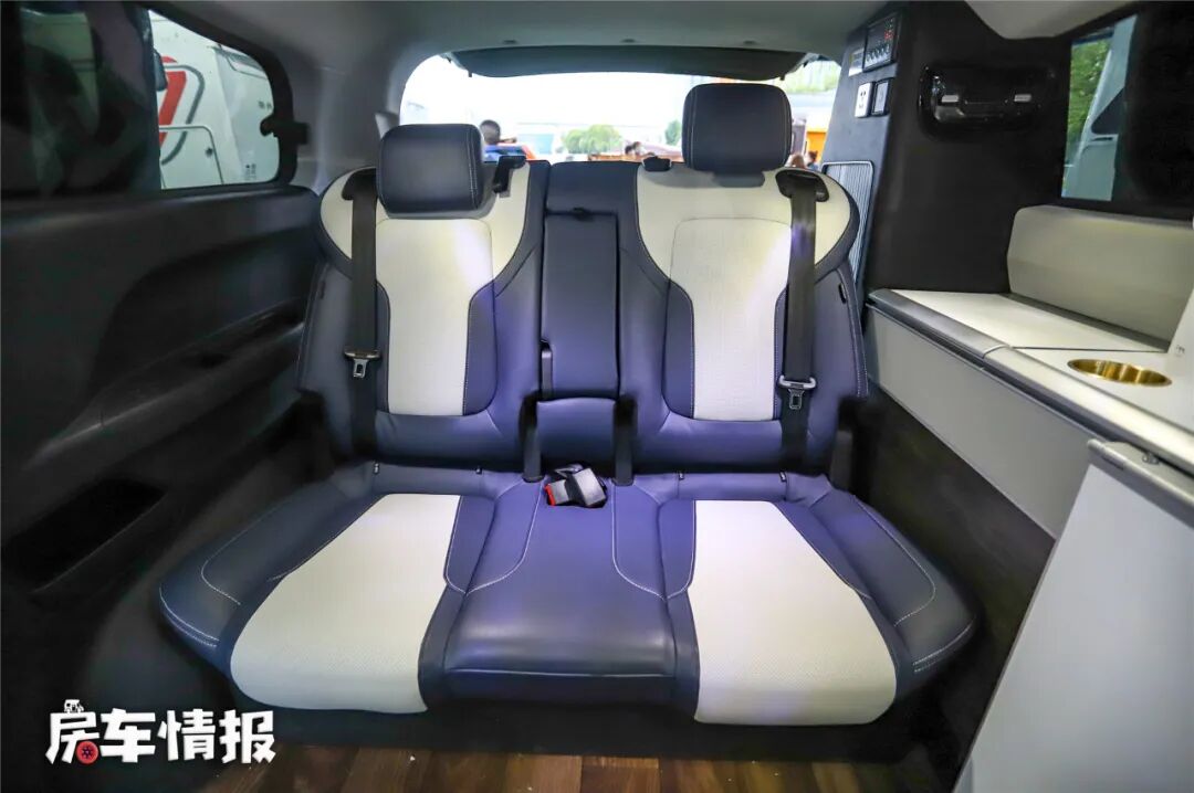 来到车厢后方,采用了的一个相对比较常规布局方式,不同的是车厢后方提供了四张单人座椅,座椅的舒适度非常不错,完全不输于那些售价百万的商务保姆车,不管是家人乘坐还是接待合作伙伴,都挺不错。