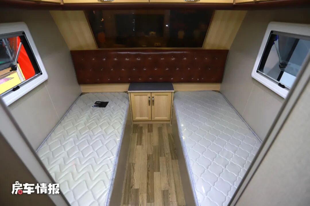 而车厢尾部的客卧更像是一间酒店标间,提供了两张单人床,分别可以容纳一名成年人,另外还配有床头柜,顶部还提供了多个储物吊柜,放一些平时换洗的衣服还是足够用的。