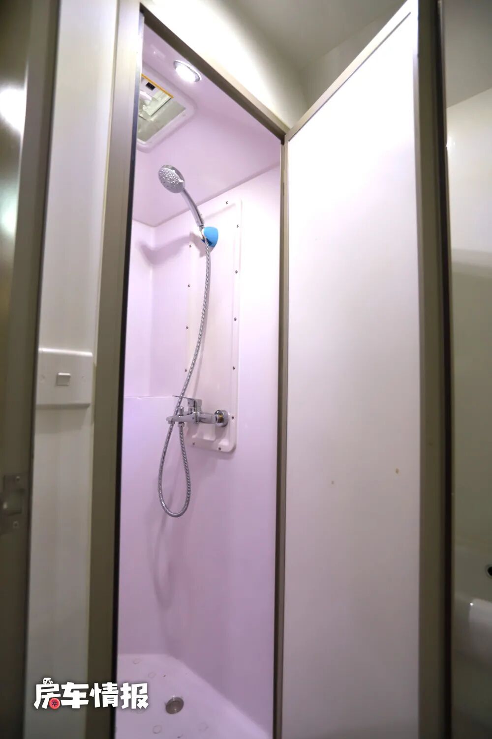 这款房车是左中门的上车设计,因为车厢较高,所以配有电动踏步,还提供了LED户外灯,方便平时老人和小孩上下车,