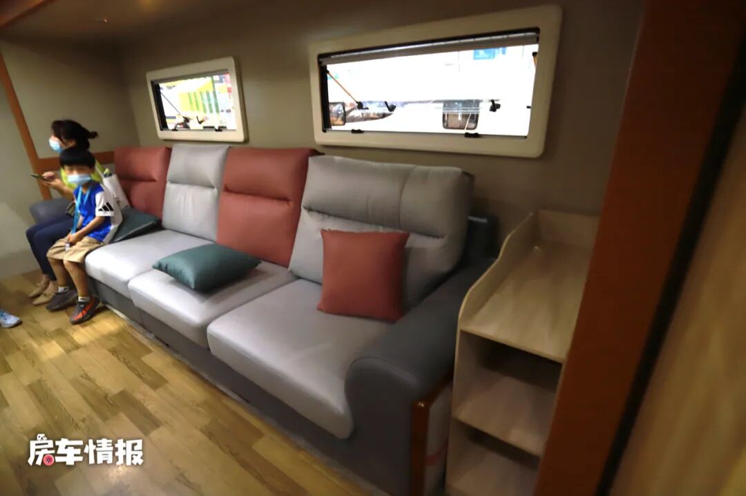 车厢中部则是会客厨房二合一的区域,在右侧的拓展机构内提供了一张长排的皮质沙发,完全可以媲美我们家中的豪华沙发,坐起来也非常的舒适。