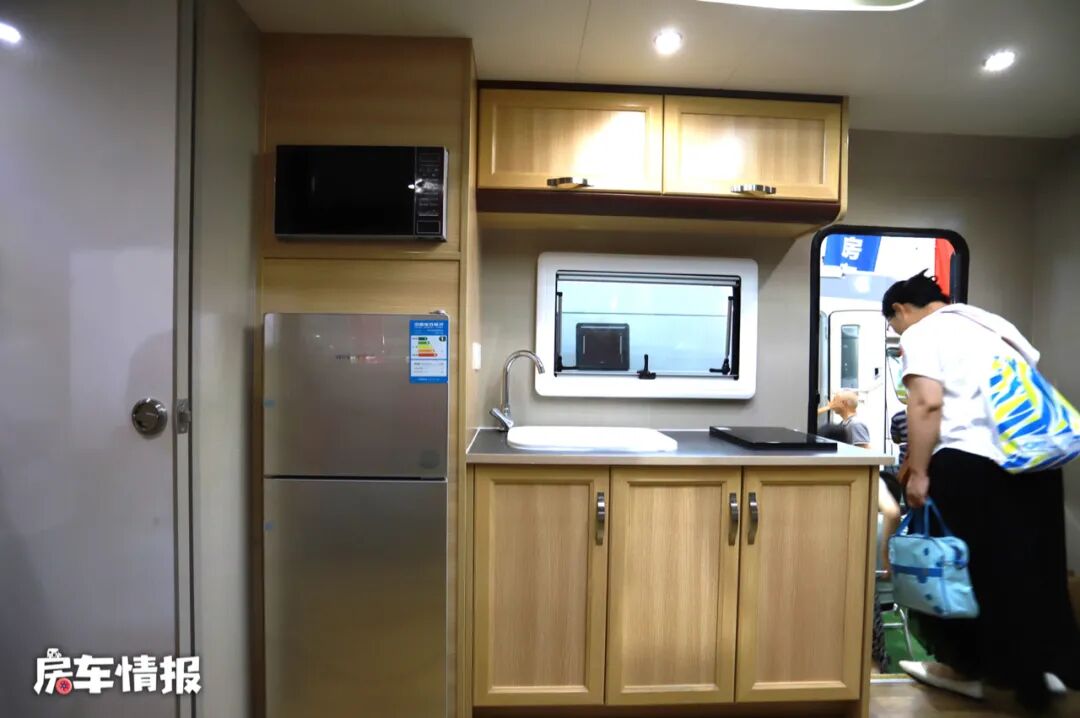 另一面的开放式厨房也拥有非常丰富的配置,上下双开门的冰箱、微波炉、电磁炉、洗菜盆等,完全可以满足后期在车内简单的炒菜做饭。
