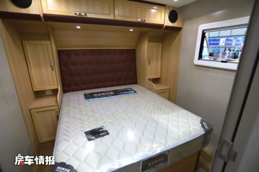 首先是车厢最前部的主卧,更像是一间大床房,里面不仅提供了一张双人床,还提供了储物空间以及音响设备和液晶电视,平时夜晚临睡前可以看看电影,享受更好的影音视听效果。