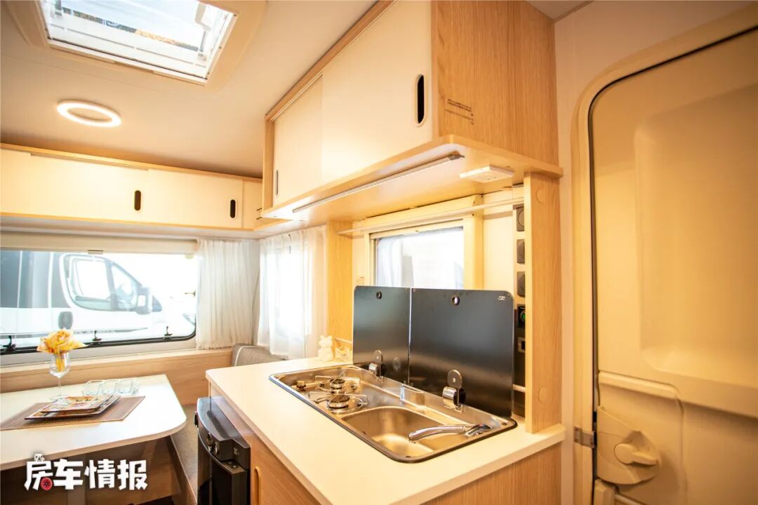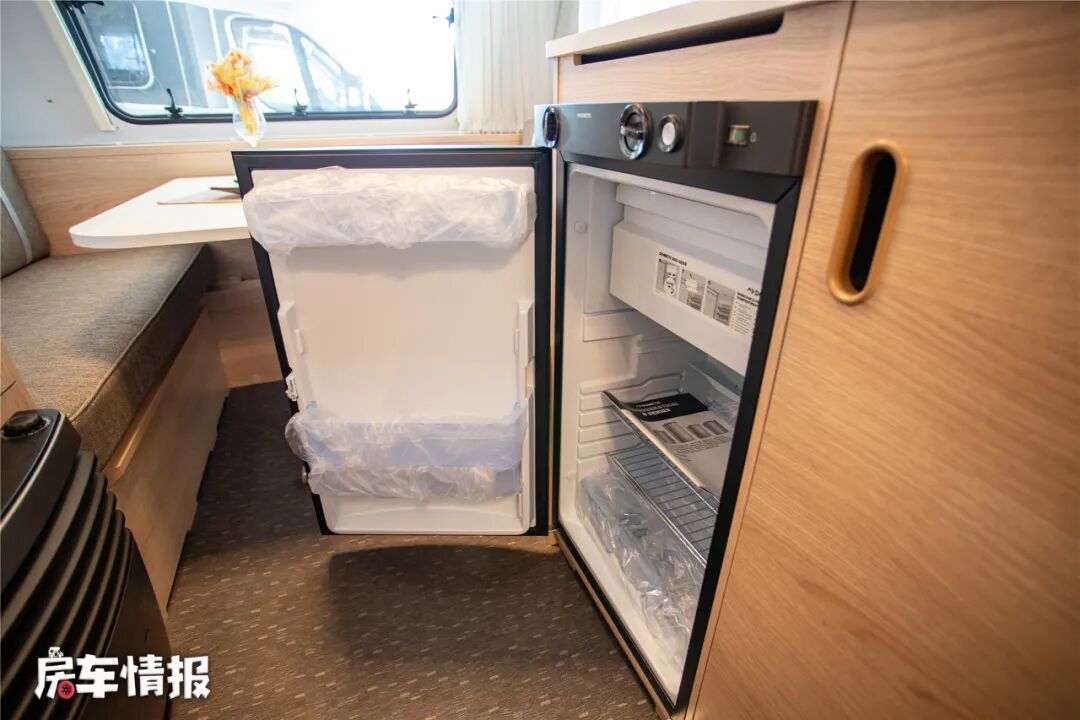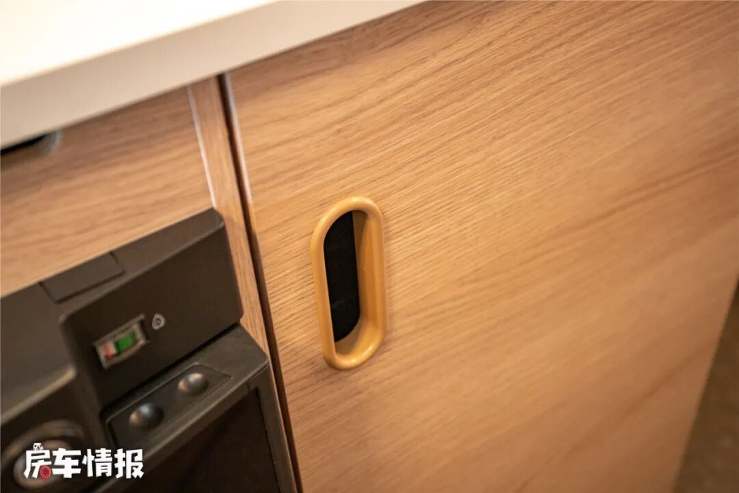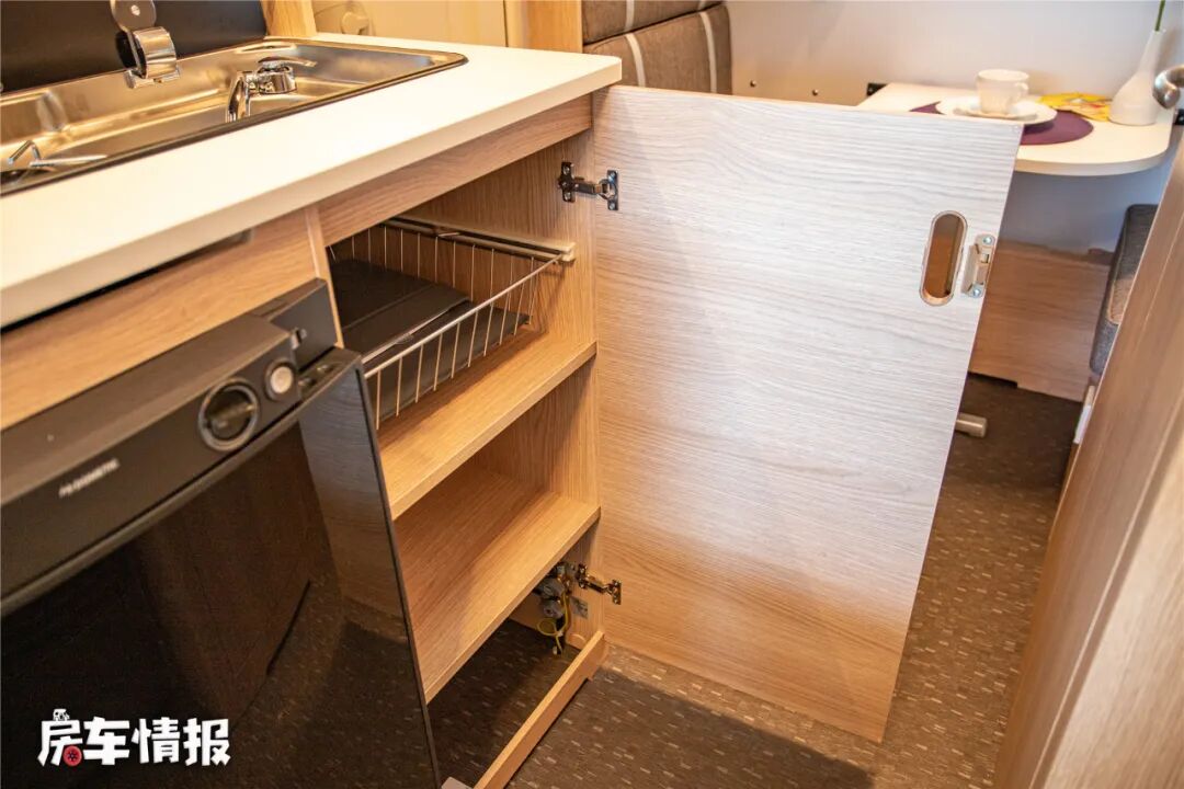 厨房位于车厢中部,整体采用一体式橱柜,这里提供了一体式燃气洗菜盆、储物抽屉、三能源冰箱等基础设备,应对日常做饭还是没有问题的。还有一个小细节,打开厨房下方的储物柜,可以看到内部细节十分细腻,还搭配了置物架,考虑的十分周到。