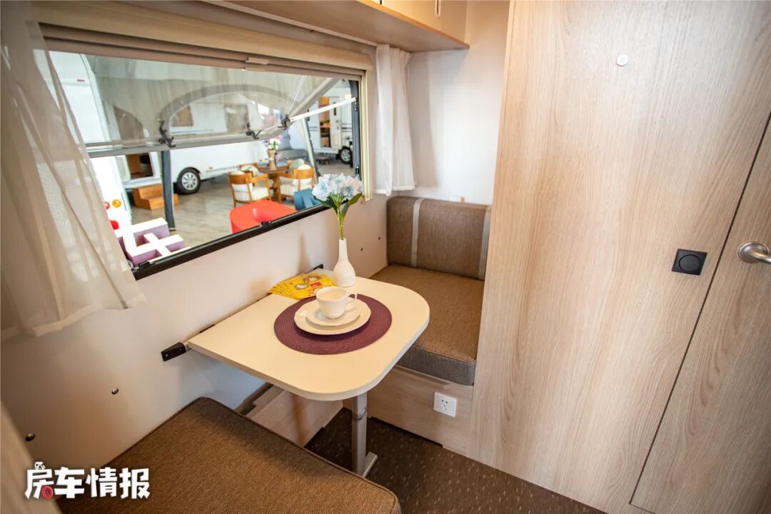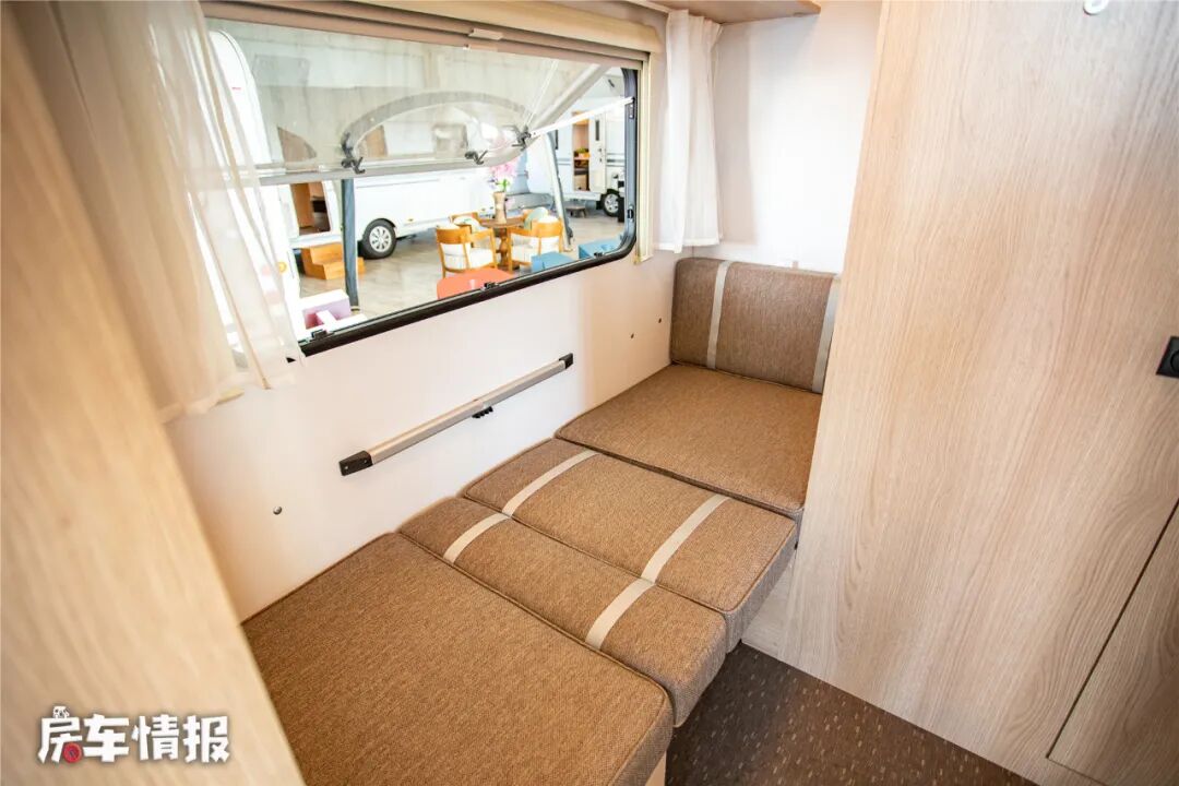 看到这里,相信不少人会问:这款车里怎么没有睡觉的地方啊?实际上这款车里一共提供2个床位休息区,只不过都是需要手动变出来的。第一个就是位于车厢尾部的单人对坐餐桌,这里可以拼成这一张单人床,这张床的长度没有问题,只不过宽度有限,但睡下一名小朋友还是没有问题的。