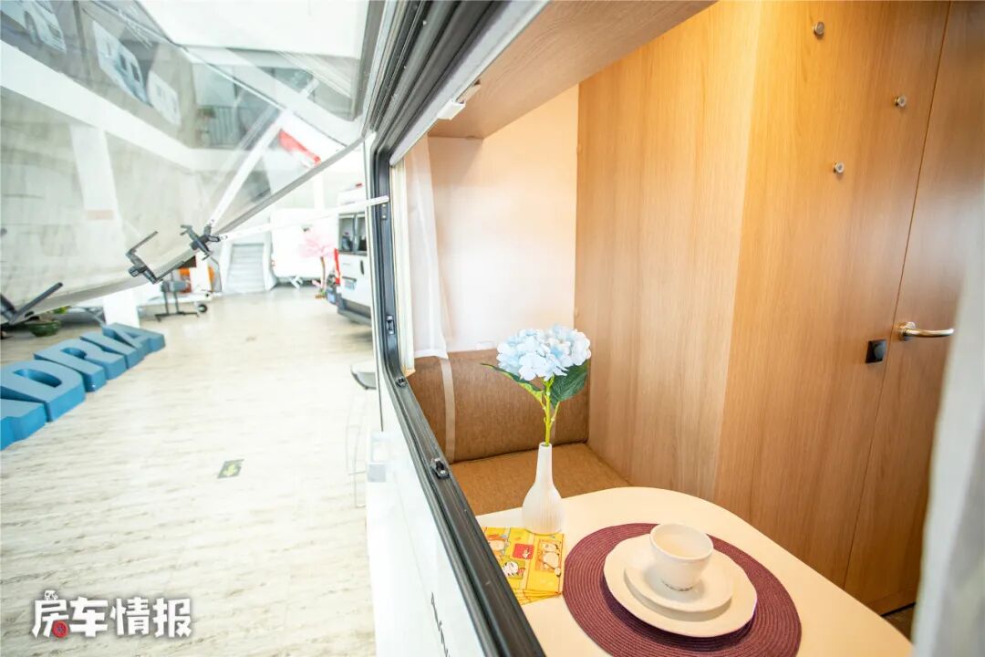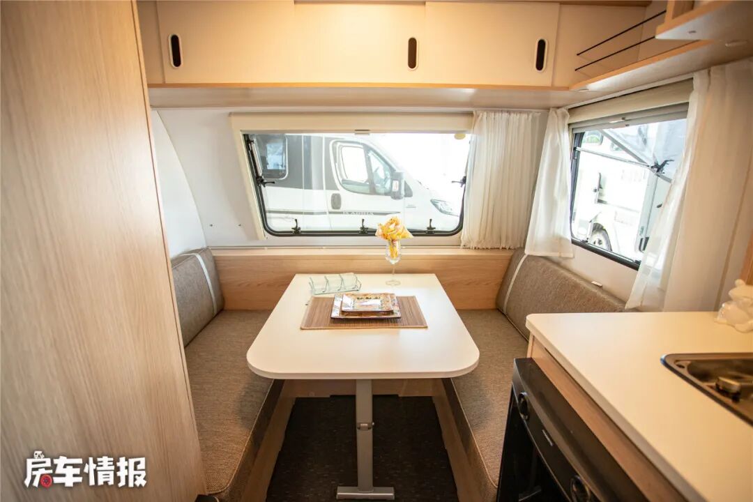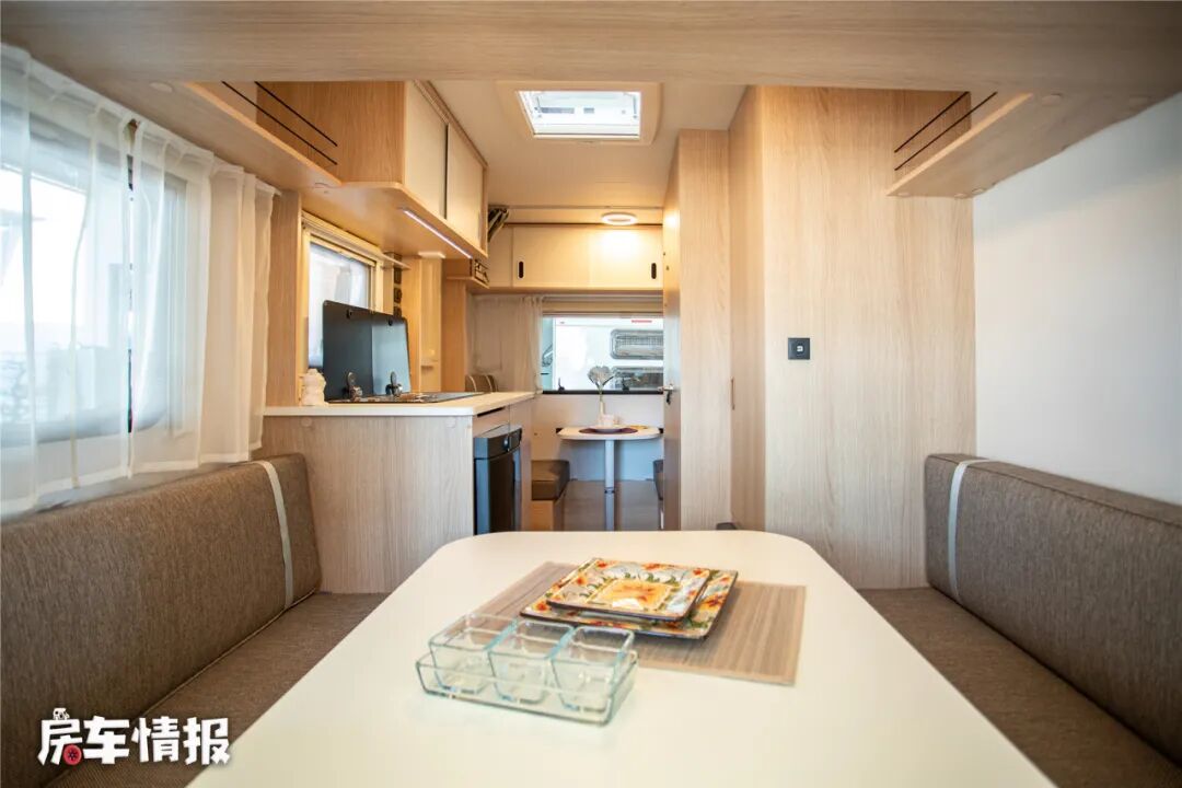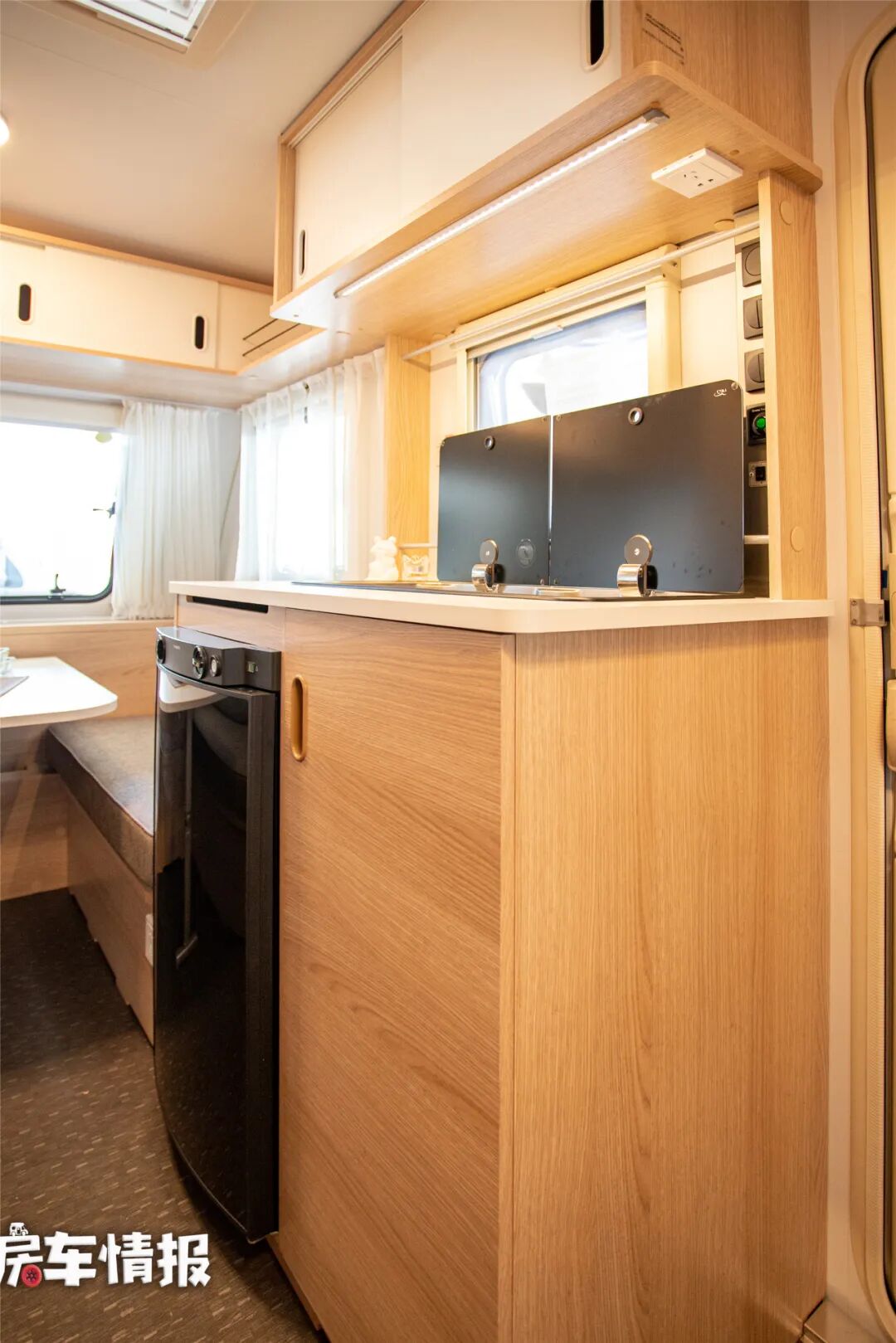 进入车厢内部,空间并不是很大,基本上和国内10万元左右的国产拖挂房车表现相当,但整体精细程度明显要更加优秀,家具板材的选用也更环保。这里值得一提的是,这款新车内部并没有其它异味儿,而国内同价位的某些品牌会有非常浓烈刺鼻气味儿,在车内待时间长了会不舒服。