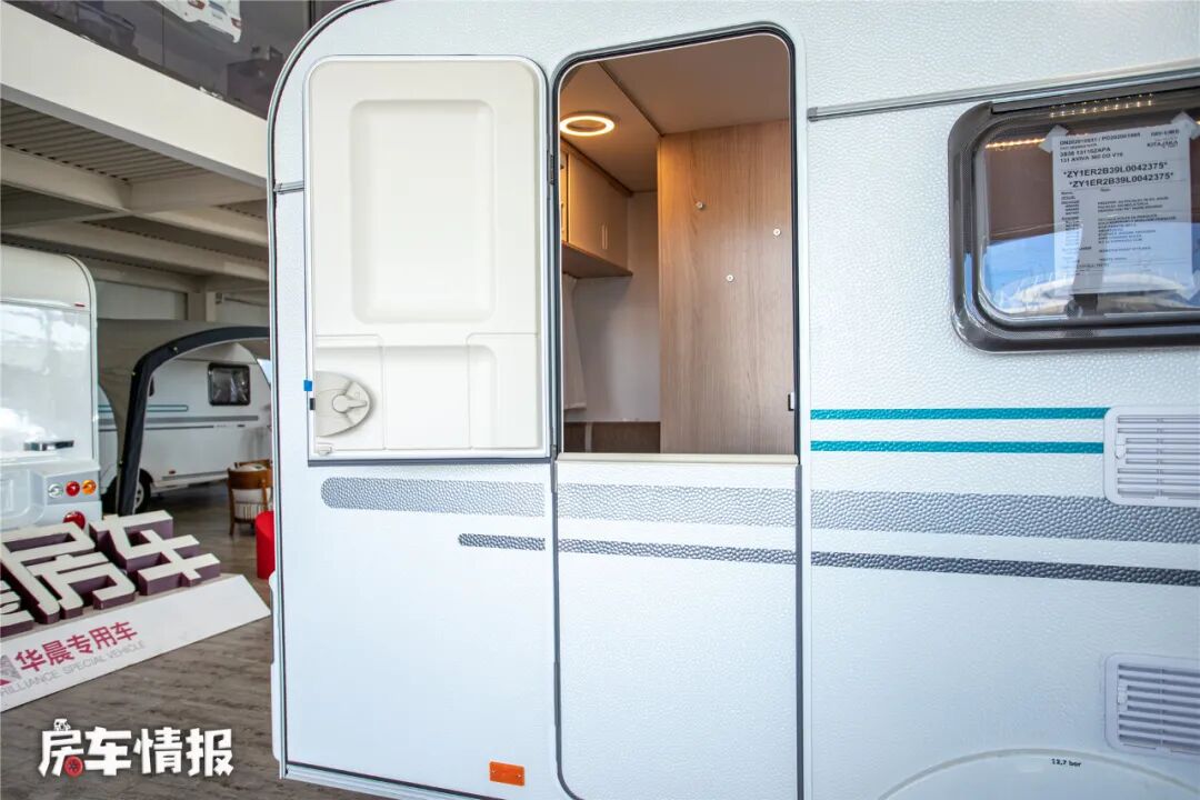 打开车厢门可以看到,这款新车采用了欧式拖挂房车上常见的“马槽门”,上下可分段开启,这样设计的好处就是当车内没有成年人的时候,可以防止车内小朋友或者小动物跑出去,避免发生危险。