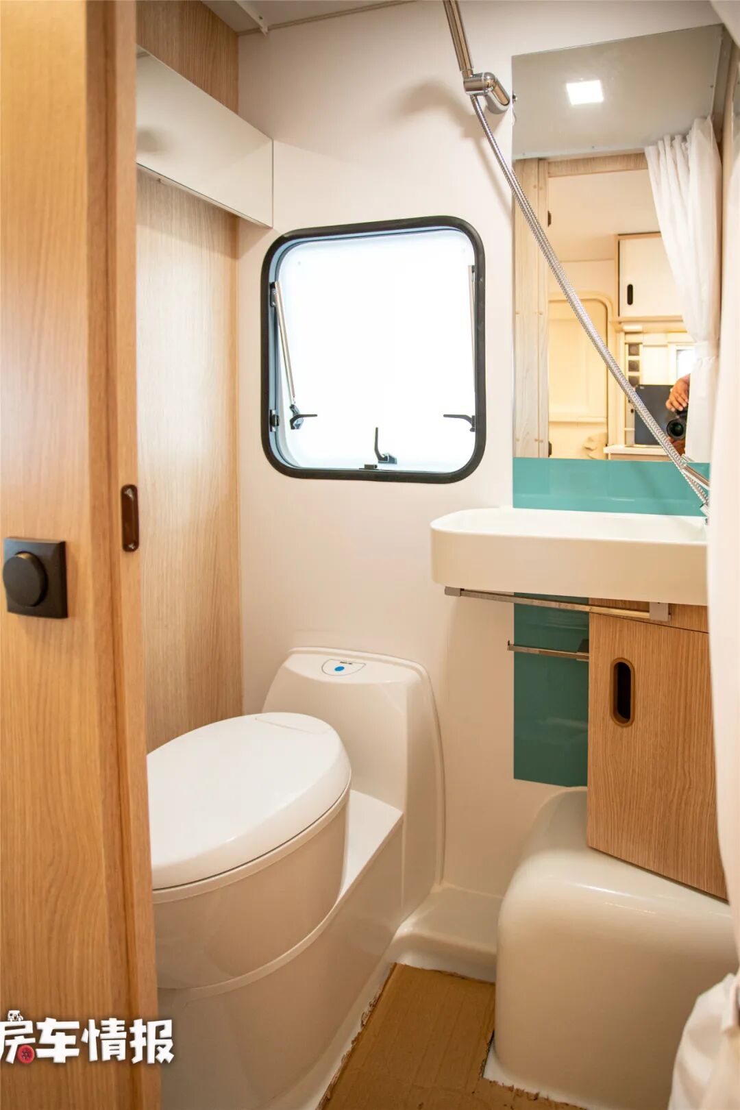 车厢中部另一侧是车上的卫生间区域,内部空间出乎意料的大,甚至比一些尺寸更大的自行式房车都要优秀不少,成年人在内部可以自由活动而不会感到局促。内部的设备也非常齐全,盒式马桶、淋浴、梳妆镜、储物柜等等一应俱全。