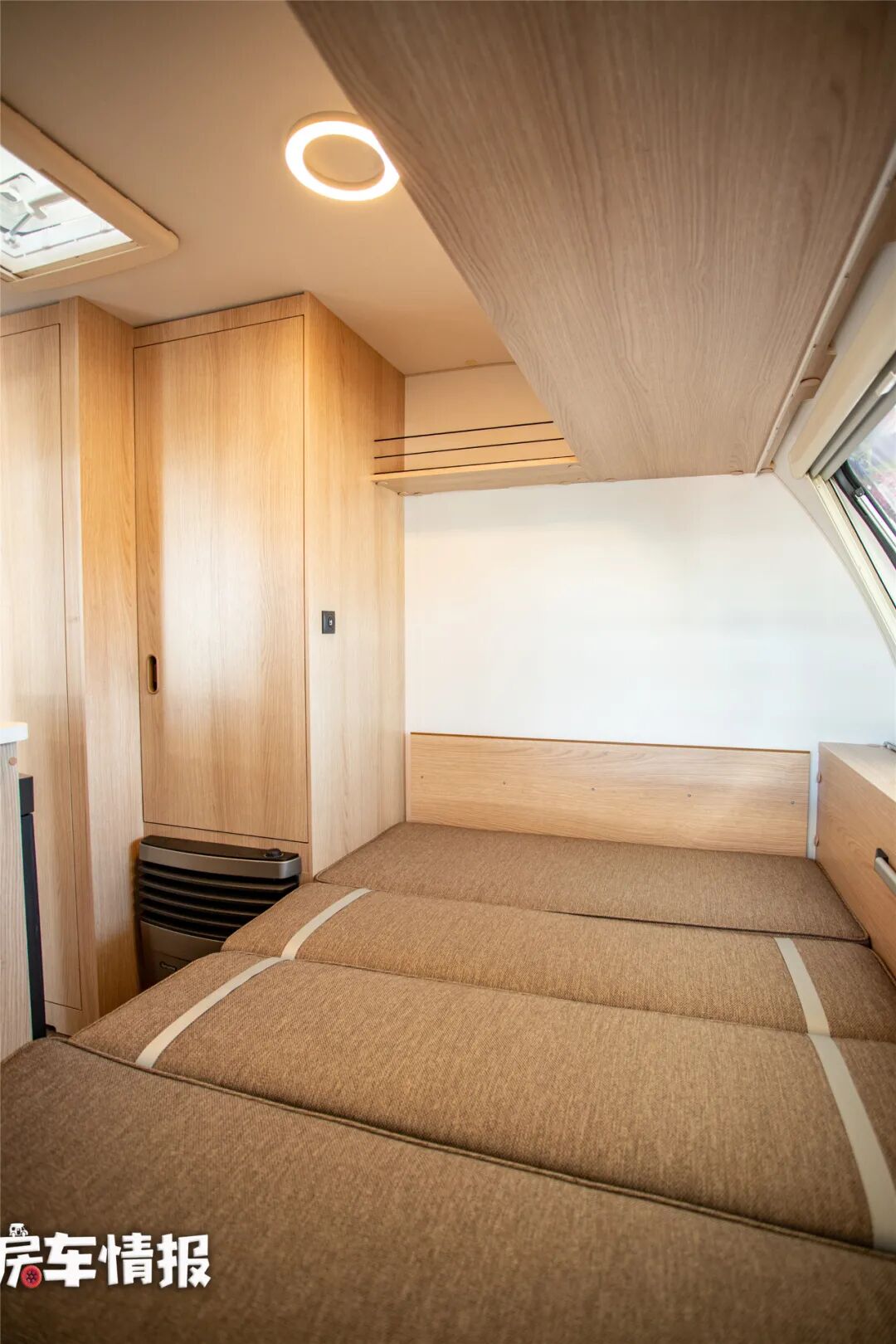 另一张床就是把车厢前部的餐桌区域拼成的双人床,这张床的尺寸整体比较大,日常满足两名成年居住没有问题,总体来看这款房车能够满足一家3口两大一小的居住需求。