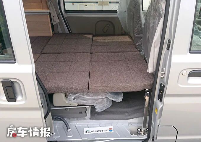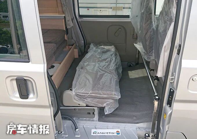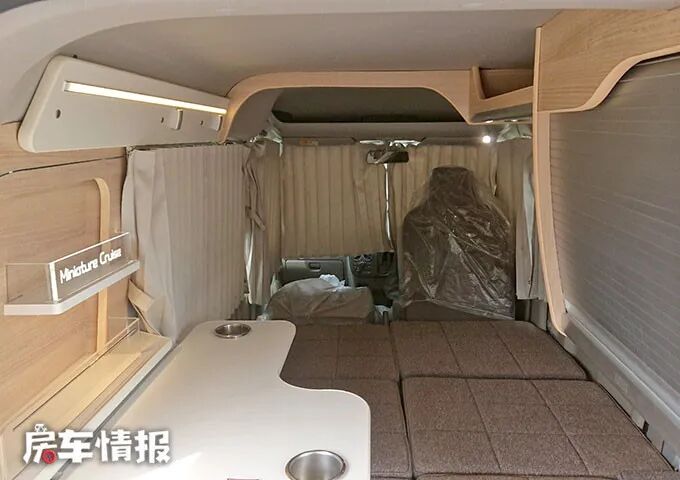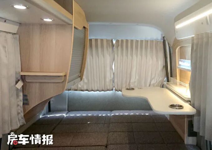 进入车辆后部的生活区,可以看到设计较为简单,由座椅、床和厨房区域组成,多使用木质板材,车窗装有遮光窗帘,看上去更加精致一些,与驾驶室内老旧的风格与众不同。
