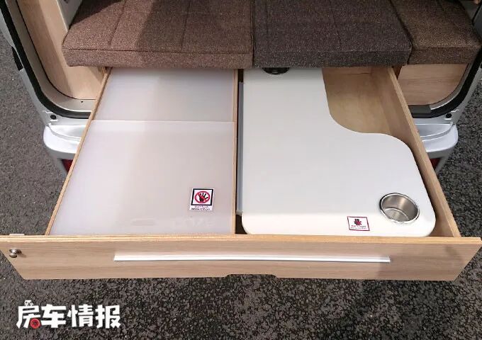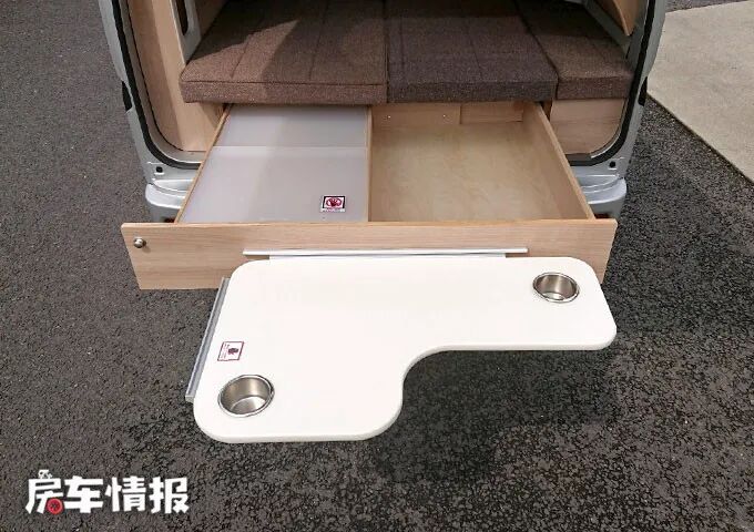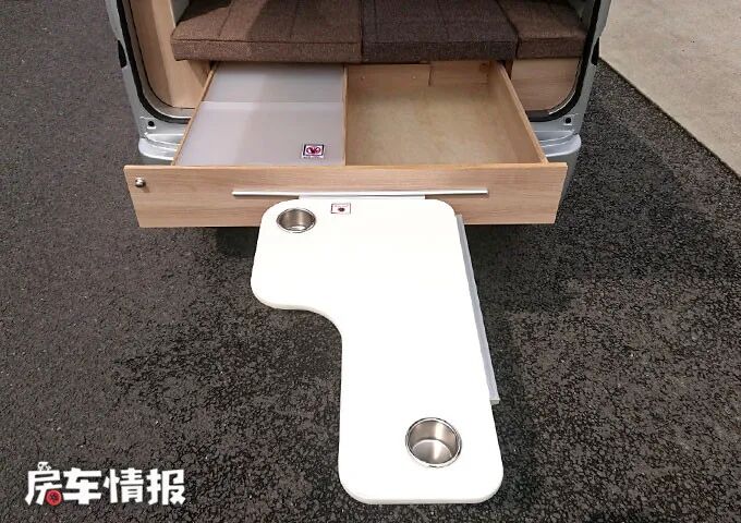 来到车尾,可以看到有一个抽屉可以拉到车外,里面还有一个L型的小桌板,长短两边都可以拼接到抽屉外,桌面上还有两个凹槽,可以将水杯放置在里面,防止从桌面上掉落。有了这个设备,在没有特意安装户外厨房的情况下,也可以在车外做饭、就餐了。