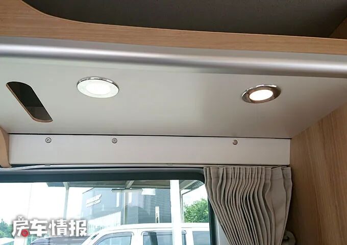 往后看,就更加精致了,顶部装有储物柜、圆形小灯和灯带,让车内更有家的氛围。