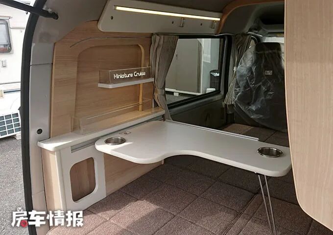 如果遇到天气不好的时候,还可以将L型桌板安装在车尾左侧的滑轨中,这样就可以在车内坐在床上吃饭或者办公了。