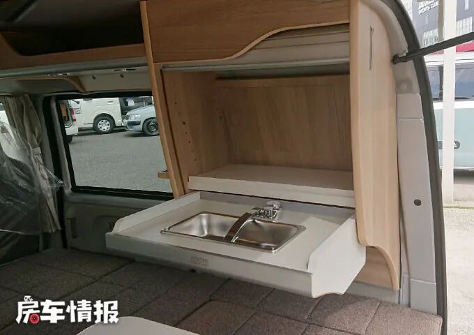 车尾右侧有一个隐藏式的洗手池,安装在这里,也方便在车内车外使用。