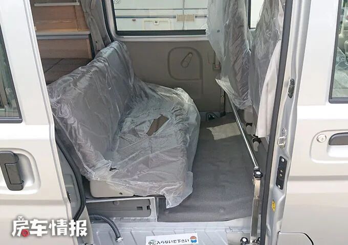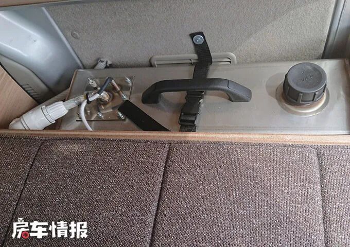 在驾驶室后,是一个简单的单排双人座椅,这里没有配备餐桌,不能算是会客区,但是在行驶中是可以乘坐的。前面有一根杆,在将座椅放平后,可以给床铺起到支撑的作用。