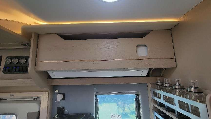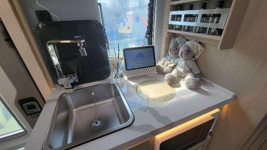 厨房分为内外置厨房,内置厨房也是配置满满,电陶炉、洗菜池、分区调料置物架、分格抽屉等;同时还很贴心的配置了可以延长的折叠桌板,上方是两个五孔插座,可以满足我们一些厨房小电器的使用。厨房区域的上方是一个家用空调,不管是制冷还是制热效果都非常明显;
