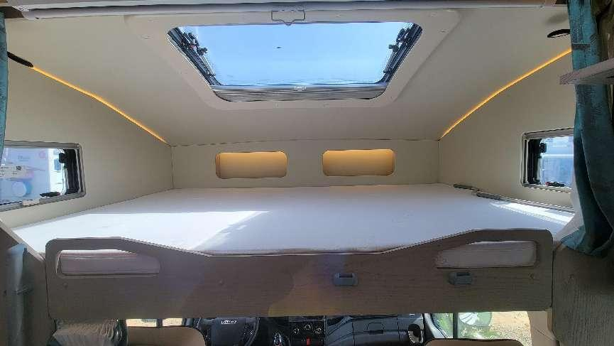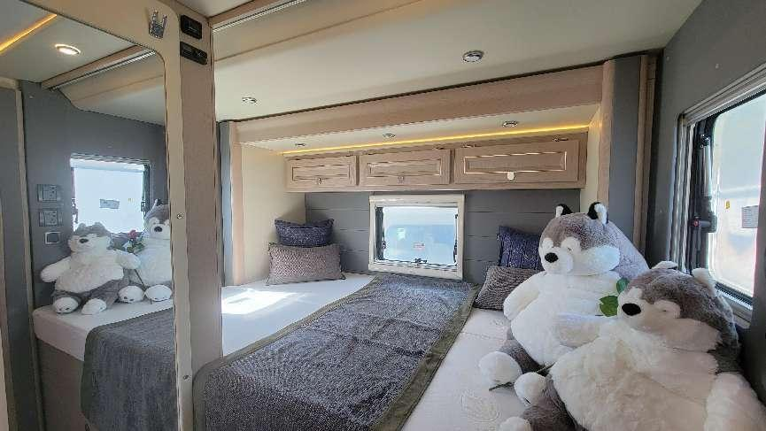 前方额头双人床,顶部带有天窗、氛围灯带、床头阅读灯等,如果天气好的情况下,可以通过天窗看星星(这似乎已经成为了车友之中约定俗成的习惯。)