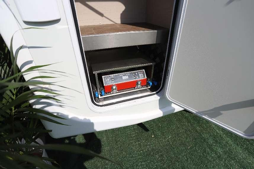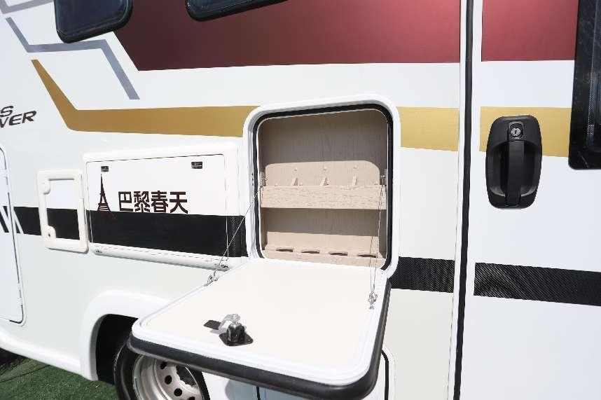 标配3.3米自动遮阳棚(含挂衣钩);下方户外厨房,标配柴油版燃气炉灶、切菜小桌板、调料置物架;户外淋浴花洒、超大储物箱;重力加水口、外接电源接口等。