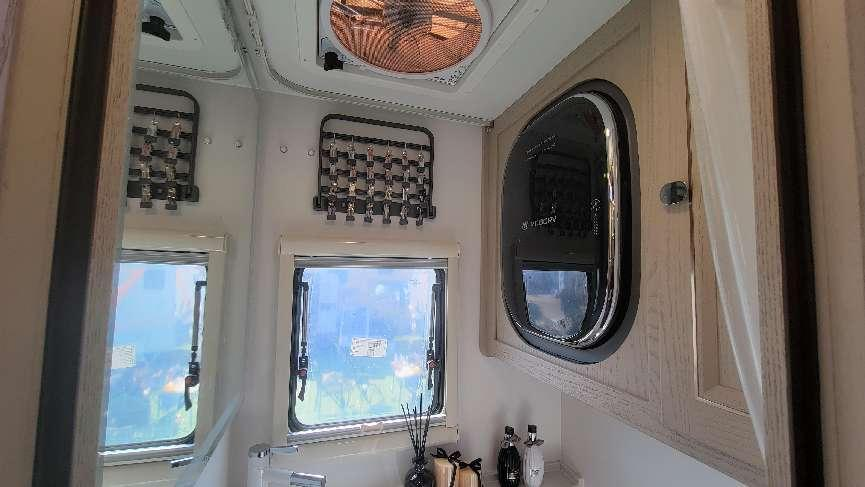 卫生间让人一眼爱上,配有通风换气扇、智能除雾化妆镜、粉碎马桶、淋浴花洒;除此之外还有带有夹子的晾衣架、房车专用洗衣机、储物小抽屉等。在户外旅途之中,在这一方小天地之间绝对是一件很享受的事情