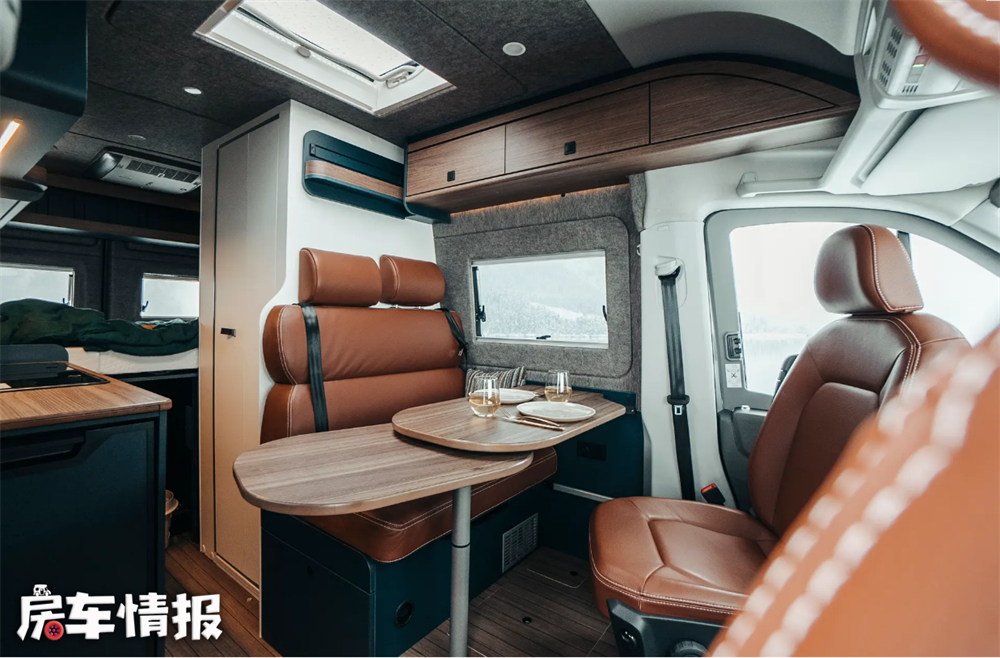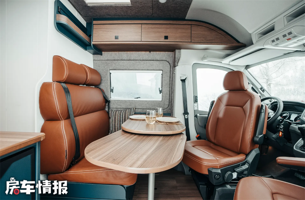 车内的四人对卡座是由一张双人沙发座椅和驾驶室主副驾座椅旋转拼成的,而且对卡座中间的餐桌是可以延申的,这样这个桌子的承载空间就非常的大,满足三四人就餐和办公是没有问题的。