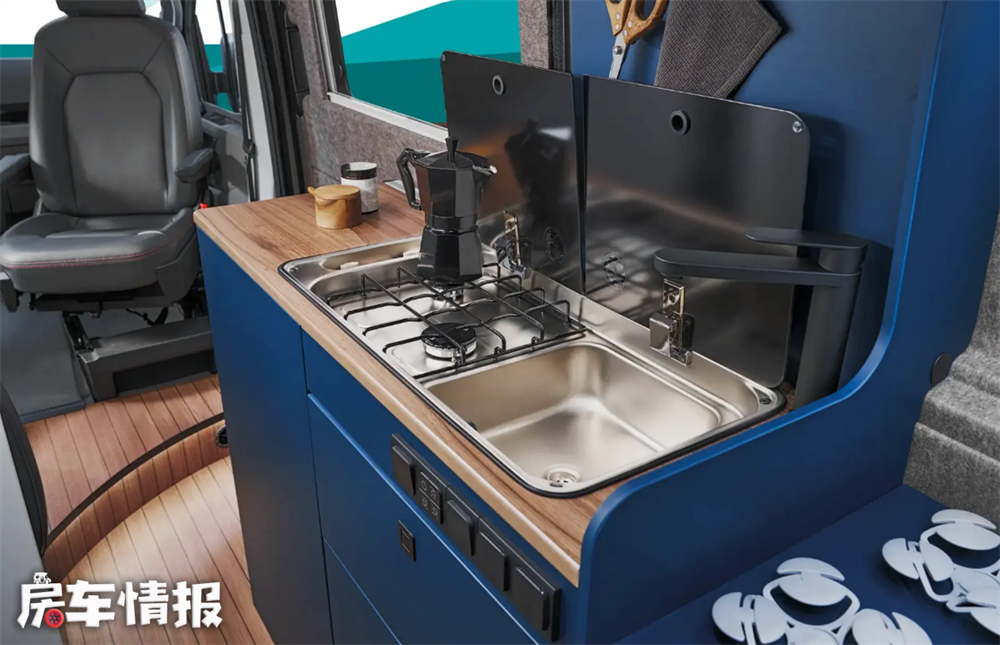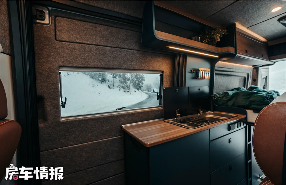 车内的厨房区域也被设计的非常的舒适,整体车内的配色是以原木色为主,搭配上昏黄的灯带使得车内的氛围更加的宜居和轻松。无论户外是刮风还是下雨车内都是一片祥和的气息。翻盖式的不锈钢洗菜池和燃气灶以及抽拉式冰箱能够满足日常的做饭需求,翻盖式的设计也能够提供足够的操作空间,并且厨房下方还带有储物空间可以放置厨房用具等。