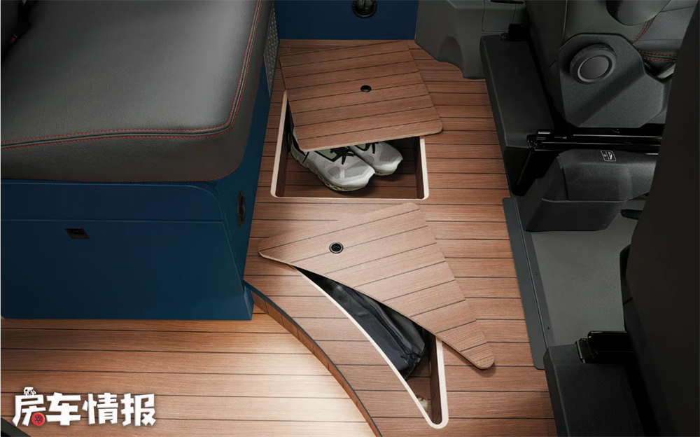 与众不同的是,它丝毫的空间都不浪费,地板上也能够有可以存放鞋子和露营装备的隐藏式的储物格,真的是将空间利用到极致了。