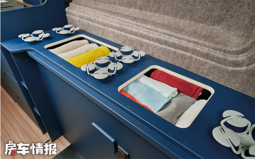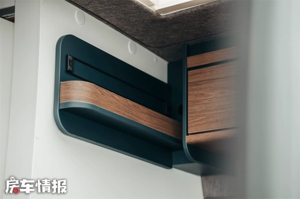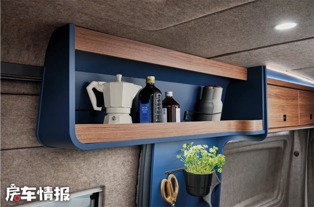 厨房上方的隔板做成了开放式,用来放置厨房的调料用品等,能够增加室内的开阔性,让车内的感觉并不是那么的压抑。