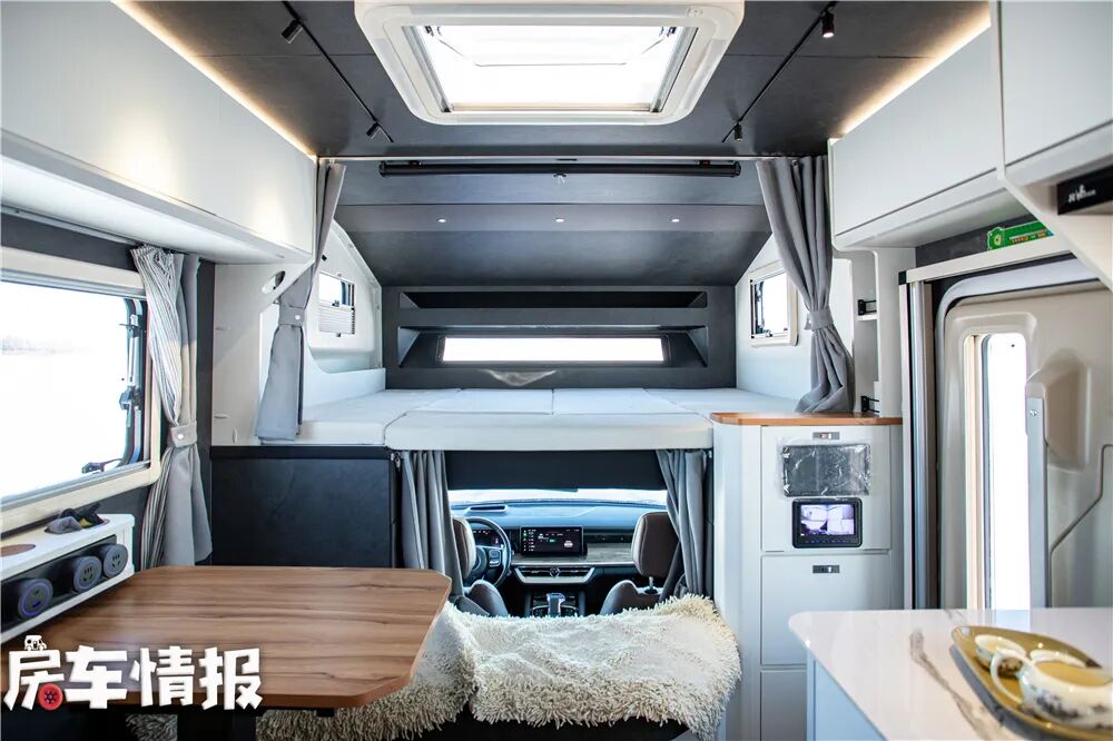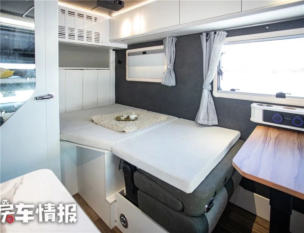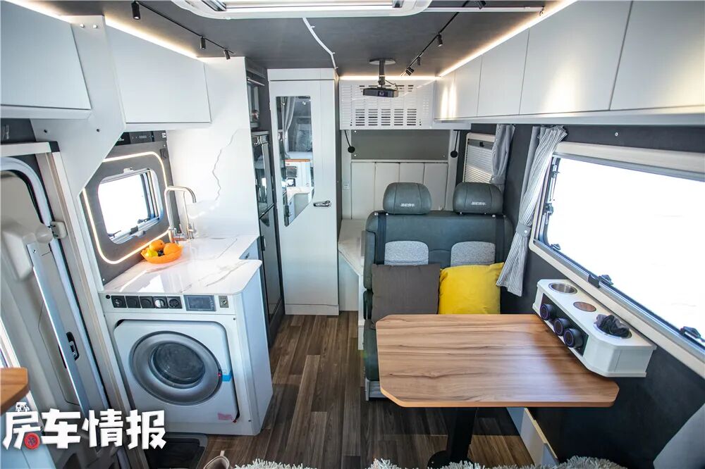 第四,大空间。整车车身尺寸被加大,那么生活区的空间自然就会被放大,实际在车内体验下来也能感受到,生活区横向空间达到了2.1米,和轻客类C型房车几乎一致,2-4人在车内活动非常宽松。