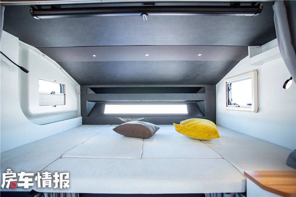 大空间带来的好处就是额头床尺寸也变大,即便是没有拓展设计,额头床的尺寸依然能够大道1米5*2米,睡下3个人都没问题;后方还提供了一张尺寸为1米8*1米1的折叠单人床。