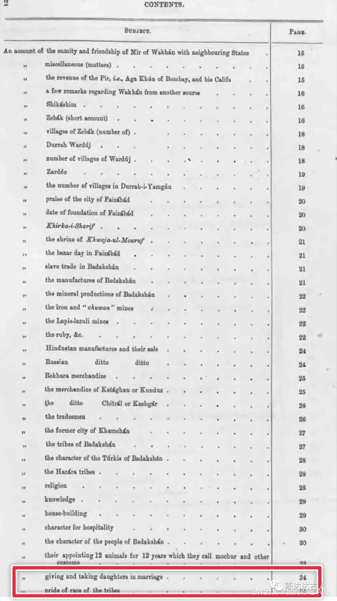 沿科克查河,在瓦尔杜吉的以下,我没有看到女人的妇女,更看不到她们的着装,但在查基兰(Chakiran)以上,我看到这里的妇女的衣着都跟瓦罕和泽巴克的女人一样。在瓦尔杜吉,除了阿克萨卡尔人(首领)和赛义德人外,妇女可以不守“深闺”,但在法扎巴德,富人和穷人,只要是女的都必须守“深闺”,呆在家里。我住在法扎巴德的一个月里,或多或少,我只看到一个罩着面纱的老妇人;她的罩袍就像一个帷幕,封得严严实实。我也没有看女人戴任何的珠宝。