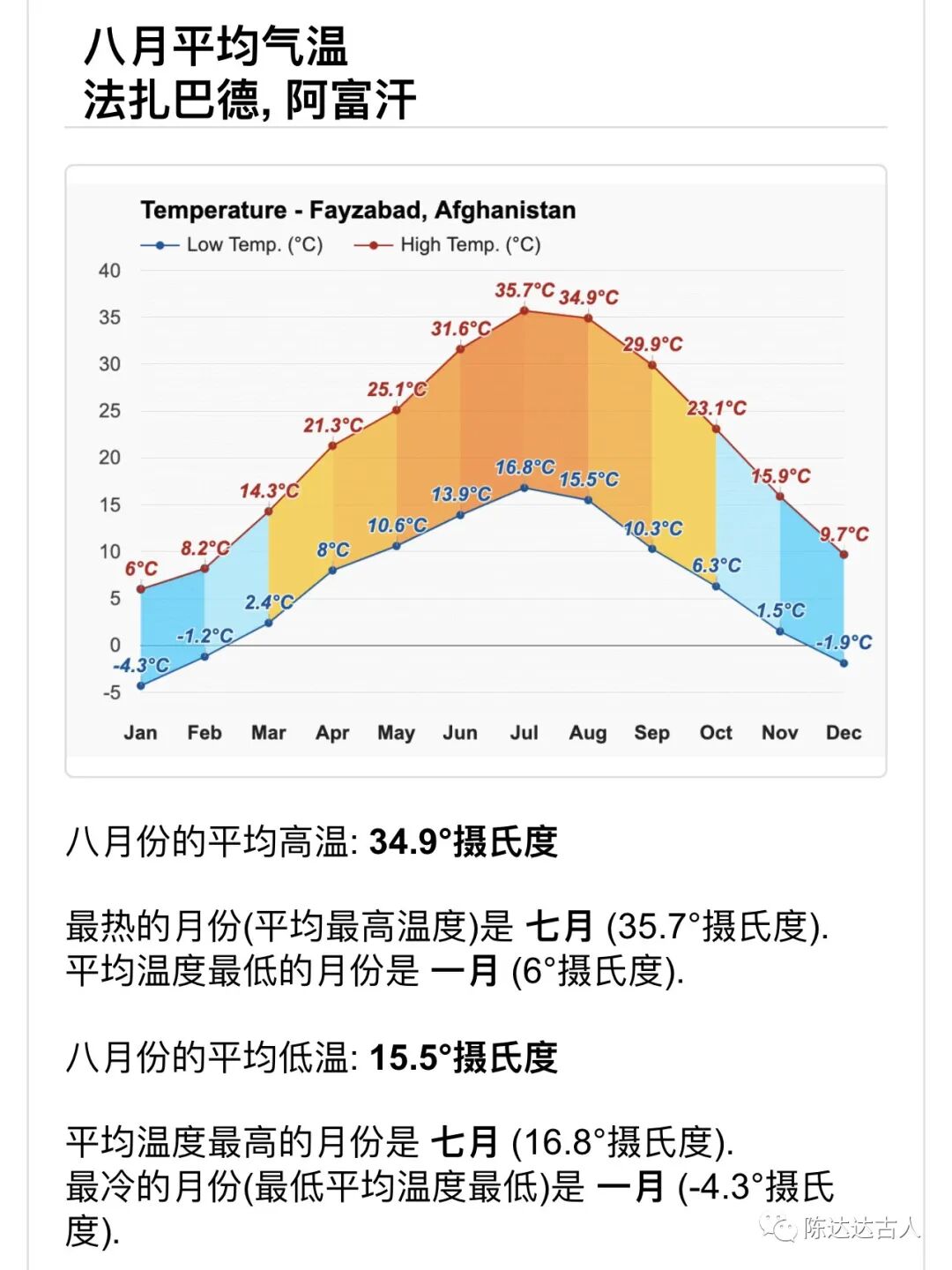 巴达克山的气候温和;从查基兰最远的边界到法扎巴德,如我所见,大约有一个经度,或者在某些地方甚至有两个经度的区域都有降雪。除法扎巴德外,一股强风从瓦罕吹向哈姆禅平原,之前我在法扎巴德的记述中已经提到,这股风一直吹向马扎里萨里夫(Mazar-i-Sherif)。