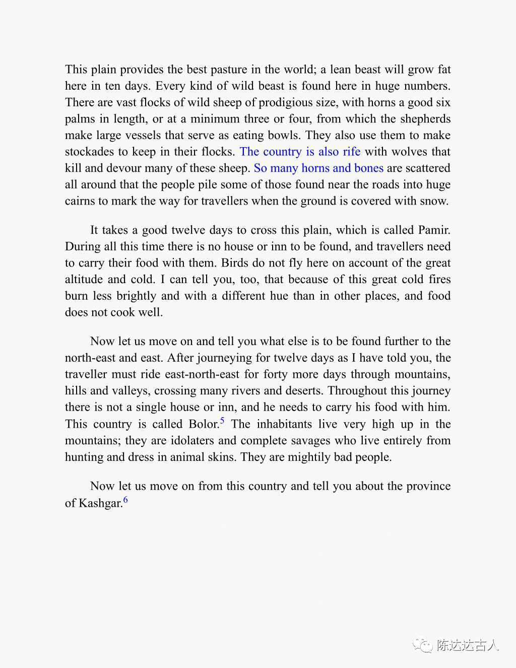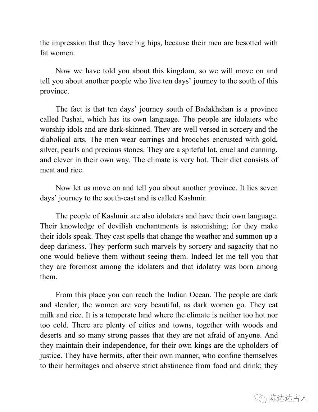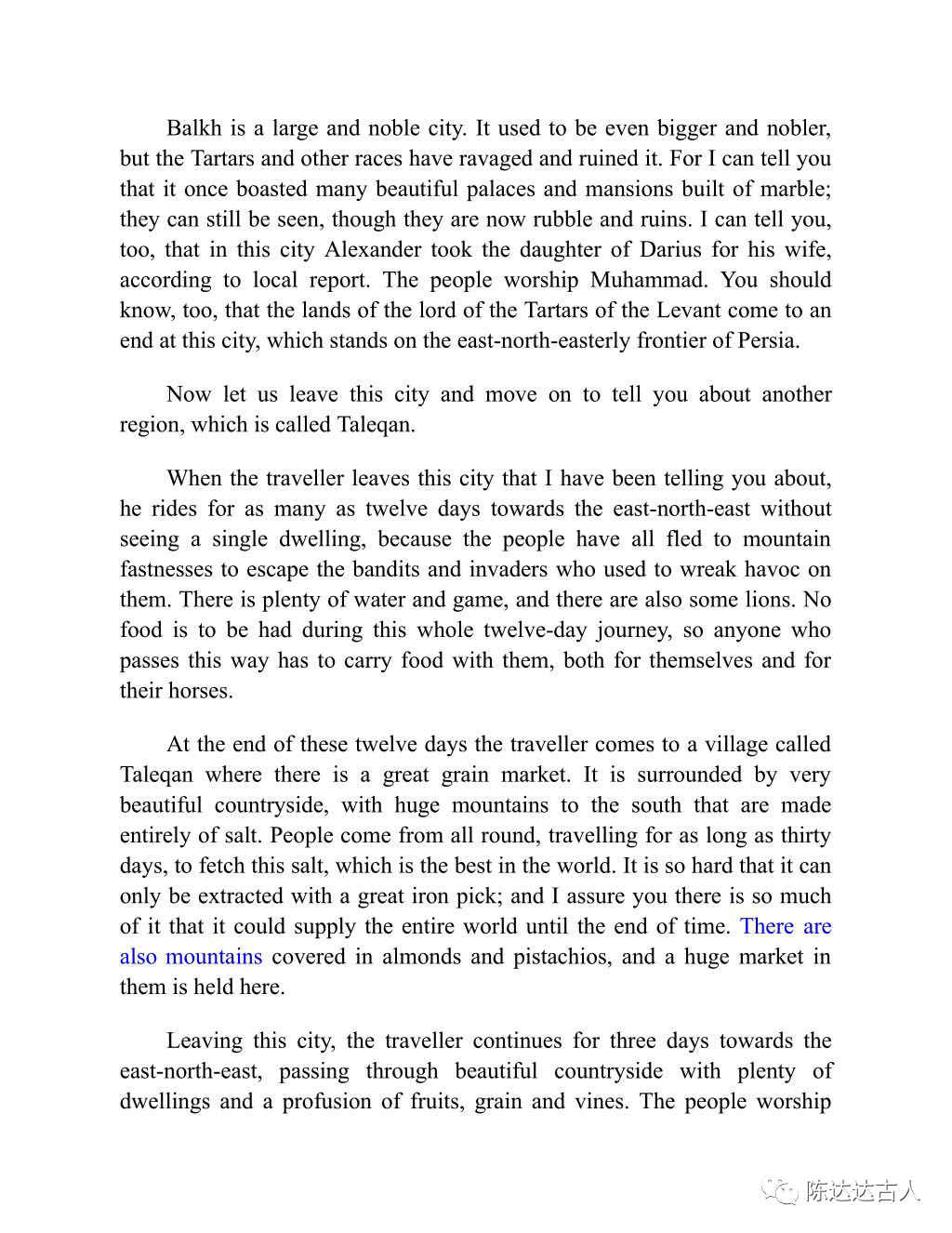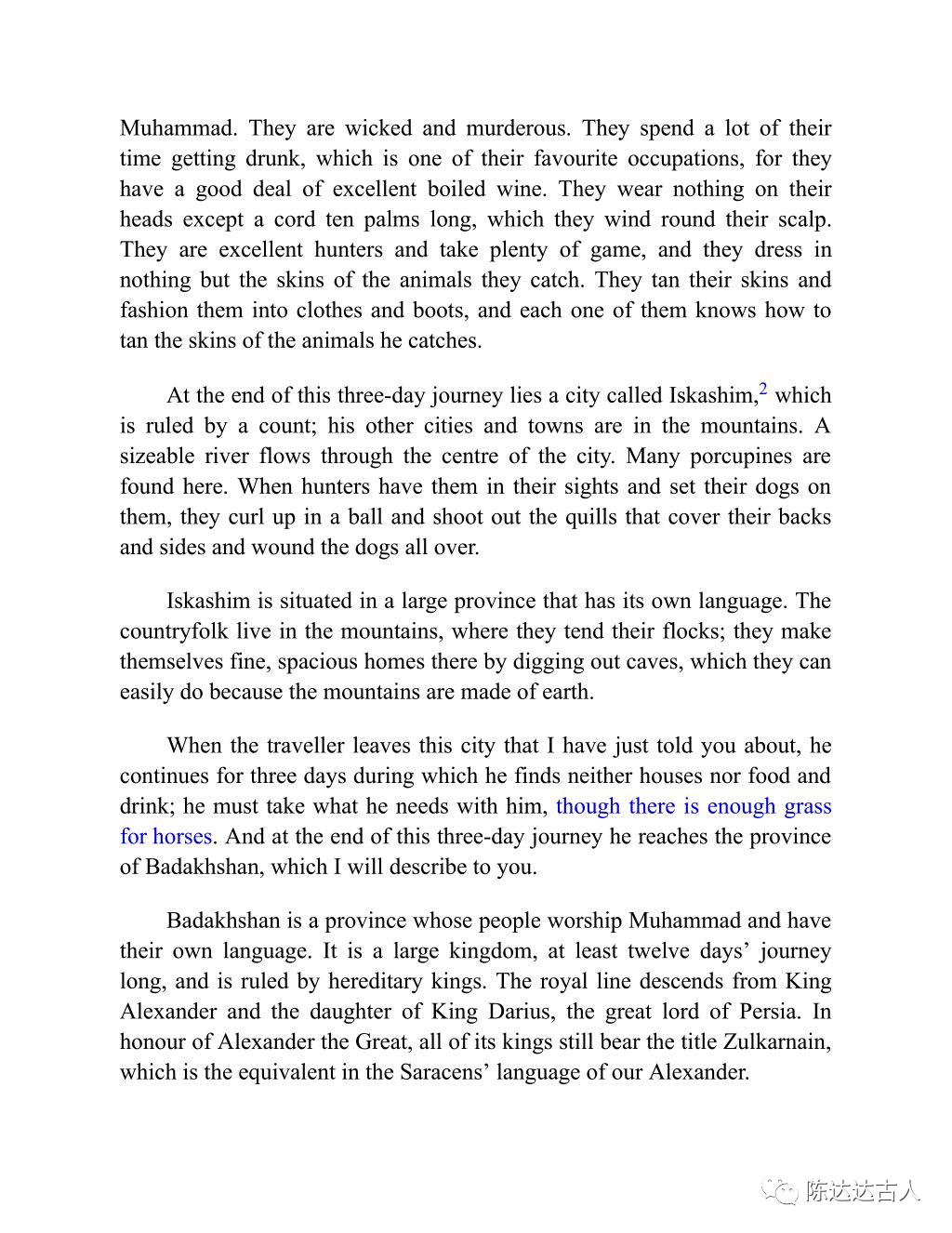 综上,所有这些编年史文字记录里,我们都只能读到一笔带过的八答黑商,及其有关领主的更替,即所谓城头变换大王旗而已。然而我们在写于那个年代的《马可·波罗行记》里却找到了马可波罗少许对这片土地的具体描述和介绍【《马可波罗行记》(法)沙海昂注,冯承钧译—上海古籍出版社2014年版(p61-p73)】。这是非常难得的一手资料,通过这些历史信息,我们几乎可以做出这样的判定,即八答黑商地区在忽辛和帖木儿之前,应该是一个古老的独立王国,它的领主抑或是伊斯兰化的突厥人、抑或是东伊朗波斯人和塔吉克人,只是到了察合台汗国,尤其是帖木儿王朝时期,察合台人征服了这里,并逐渐有突厥化的蒙古人迁入,八答黑商的领主也变成了察合台人(蒙兀尔人)。不过,八答黑商的本地人却一直坚称他们是亚历山大的后裔。另外,我们也可以清楚的看到,古代丝绸之路,从喀什噶尔翻越帕米尔高原,经瓦罕走廊至巴答黑商到吐火罗斯坦(活国)之昆都士和巴里黑,抑或是反过来,由西到东的丝路古道依然是畅通的,丝毫没有因为战争和宗教的原因而中断,只不过当时那里的人们大都已经改信了伊斯兰教,成为了穆斯林信徒(待续)。