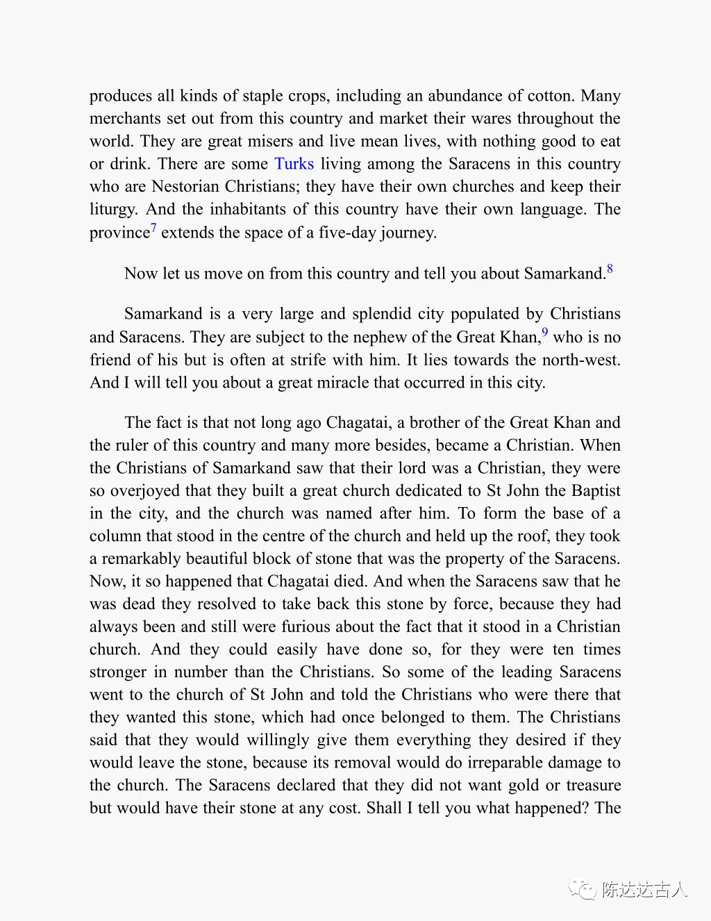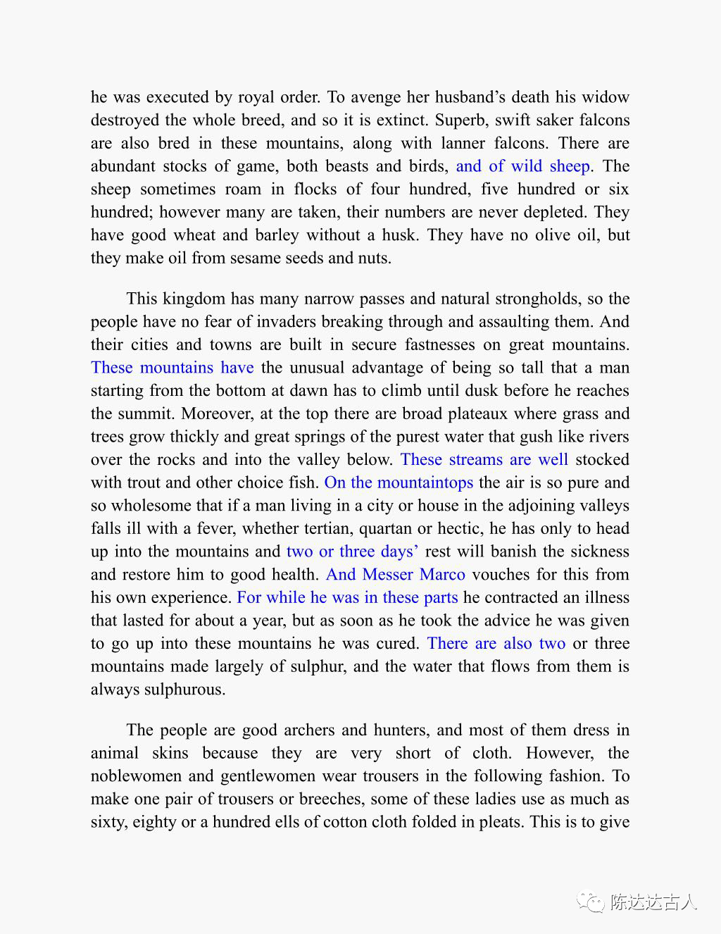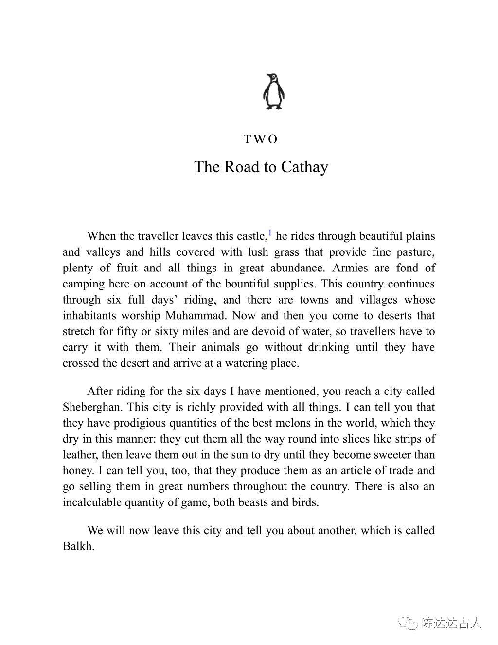 以下是冯承钧先生根据法国人沙海昂的注释翻译的《马可波罗行记》(上海古籍出版社2014年版p61-p73),有兴趣者可以阅读参考。另外,由英国企鹅兰登书屋(PenguinRandom House UK)推出,并由NIGEL CLIFF翻译和注释的的英文版《MARCO POLO/The Travels》,也很有参考价值,读者可以对照阅读。