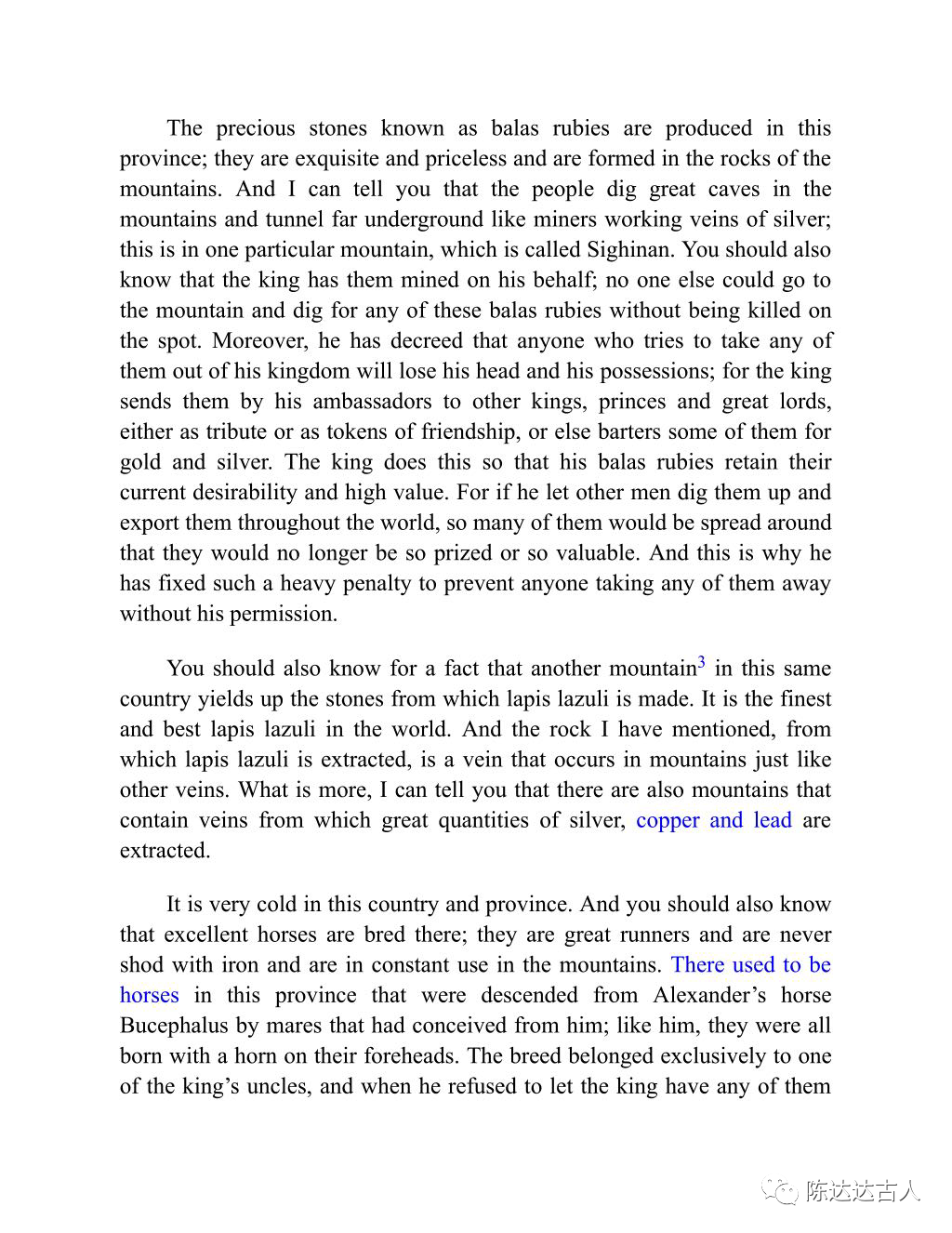 同一境内别有一山,出产瑟瑟(azur、lapis-lazuli),其莹泽为世界最。产于矿脉中,与银矿同。他山复有银矿不少,所以此州最富。然其气候亦最寒。兼产良马,善于奔驰,蹄下不钉蹄铁,而能驰骋山中及崎岖之地。此地诸山又出产大鹰(fauconsacre)同郎奈鹰 (faucon lanier),猎兽飞禽为数亦夥。又产良好小麦及无壳大麦,出产芝麻油、胡桃不少,惟无橄榄油。