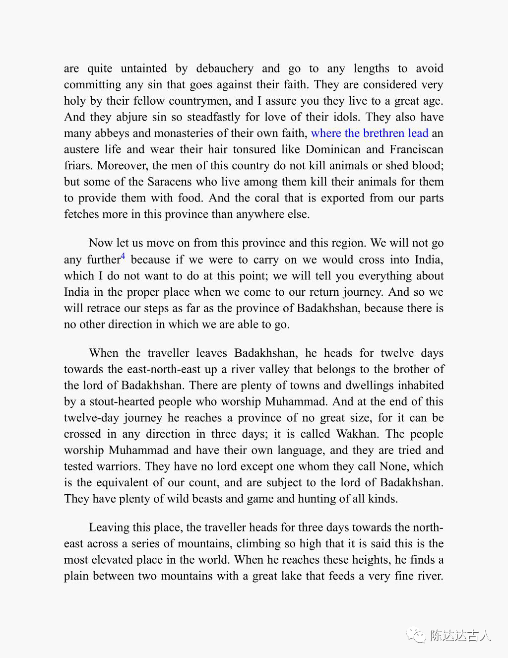 从巴达哈伤首途,骑行十二日,向东及东北溯一河流而上。此河流所经之地,隶属巴达哈伤君主之弟。境内有环以墙垣之城村及散布各处之房屋不少。居民信奉摩诃末,勇于战斗。行此十二日毕,抵一大州,宽广皆有三日程,其名曰哇罕( Wakhan)。居民信奉摩诃末,自有其语言。善战斗,有一君主名日那奈(None),法兰西语犹言伯爵也。其人称藩于巴达哈伤君主。