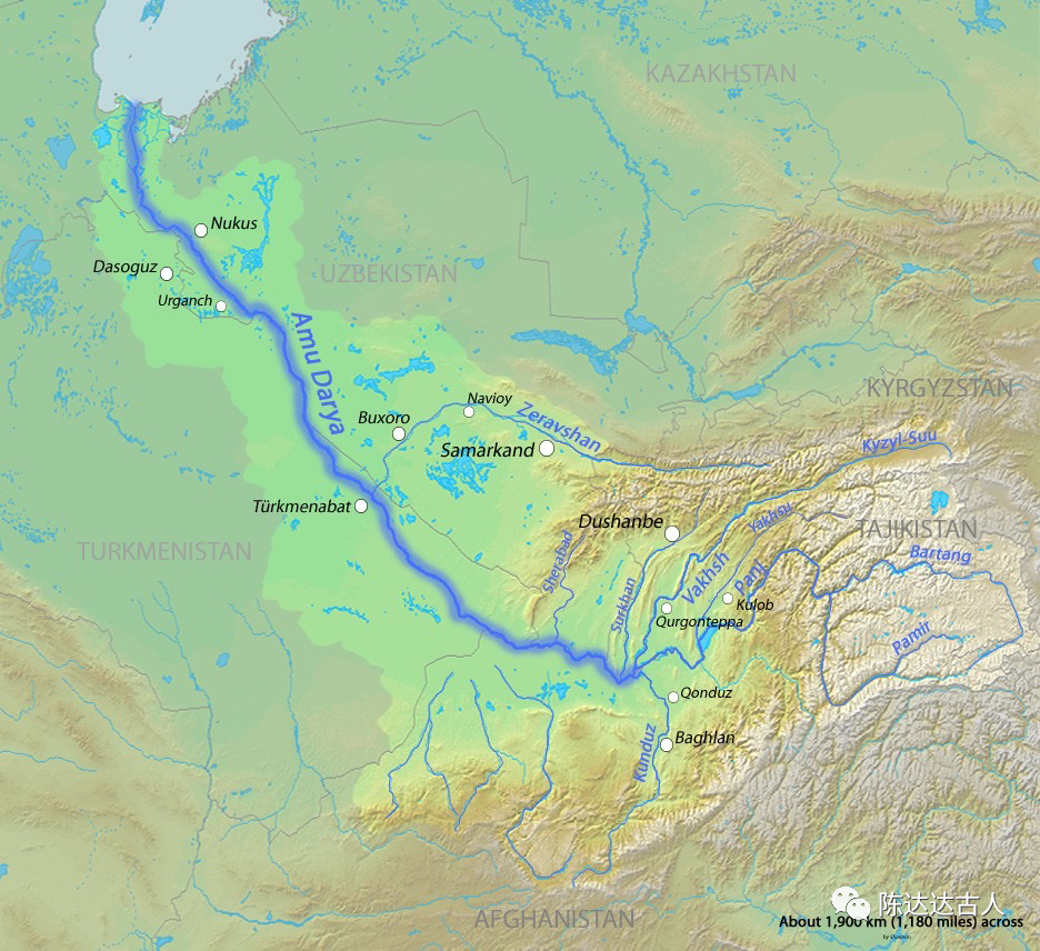 本案注:阿姆河,古希腊罗马人称之为奥克萨斯河(Oxas),中国古代称为“乌浒水”。发源于今阿富汗、中国,巴基斯坦三国交界的喀喇昆仑山脉,在中、阿交界的瓦赫吉尔(南瓦根基达坂)分水岭,有一冰洞被认为是阿姆河正源。在瓦罕上部峡谷,即今帕米尔河交汇处的喀拉潘贾(Kala-Panj)以上河段习惯称之为瓦罕河,并在博洛尔之布罗吉尔山口(Barogil)有来自兴都库什山脉的布罗吉尔河汇流于萨尔哈德(Sarhad)。从喀拉潘贾流过瓦罕河谷、什格楠、鲁尚、万吉和达尔瓦兹这些巴达赫尚山区后,与来自北面骨咄山区的瓦赫什河(Vakhsh)交汇流入河中地区。这条在山区被称之为喷赤河(Panjab)的河流就改称为阿姆河,最后在花剌子模地区注入咸海。