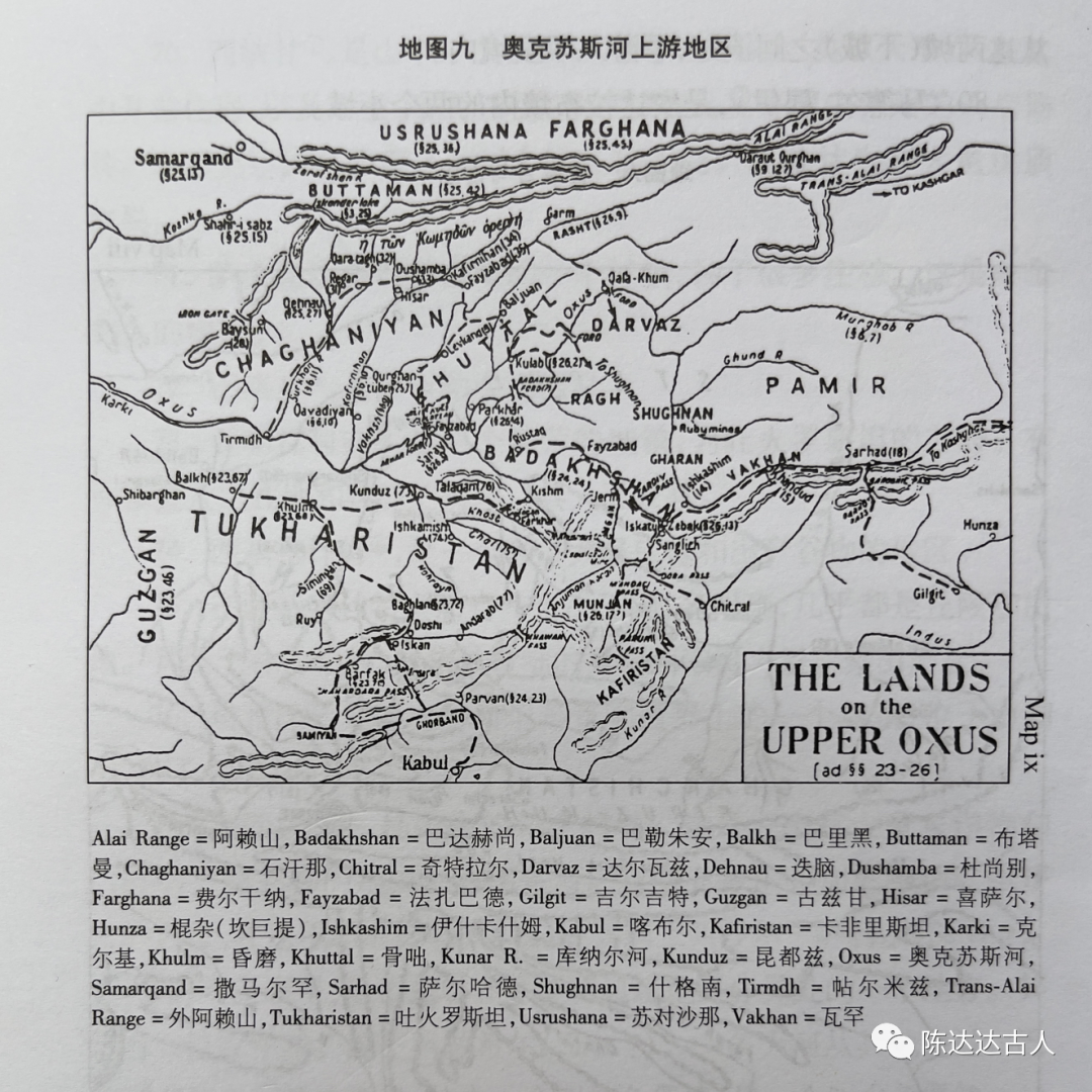 【瓦赫什河发源于突厥族葛逻禄部之地,流经帕米尔(阿赖和外阿赖山谷)、拉什特、库麦德(Kumidh/kumad)诸省。由此可知当时帕米尔包括阿赖岭在内。拉什特早在十世纪就被认作是穆斯林辖境的一部分,其地为今喀刺提锦。库麦德省,据托玛舍克考证,当即托勒密提到的 Koun&OvopeUDn,亦即玄奘提到的拘谜陀国。依照图曼斯基抄本,卡菲尔尼干河(Kafirnigan)上游亦在该省境内。苏尔罕河(Surkhan)诸源之一,哈刺塔格河(Karatag),当时称为库姆河(Kum-rud)。此省居民为库米吉人(Kumijis)【库米吉人以及与他们互有关联的坎吉纳人(Kanjina)都居住在布特曼山(Buttam/Butman)旁的谷地内。很有可能,他们是在中亚早期建立了强大帝国的塞种或厭哒的后商;托勒密加提到一个名为 Kwunoal的塞种部落(参看米诺尔斯基,Hudad al -‘Alam)】,被马克迪西列入突厥族。卡菲尔尼干河旧称拉米德河(Zamil/Ramidh,),其上源之一至今仍保有这一名称—拉米特河(Ramit)或饶米特河(Roumit)。卡菲尔尼干与瓦赫什二河之间为瓦什吉尔德(washgird)与库瓦迪延(作久越德健/Quwadhiyan)(亦称卡巴迪安/Kabadian)二省区。】