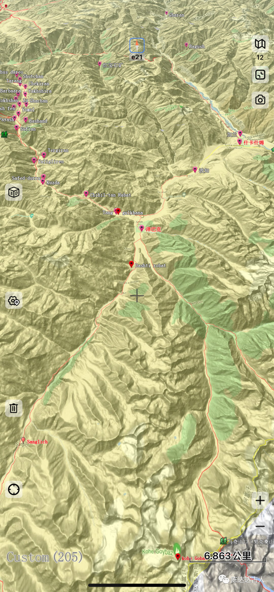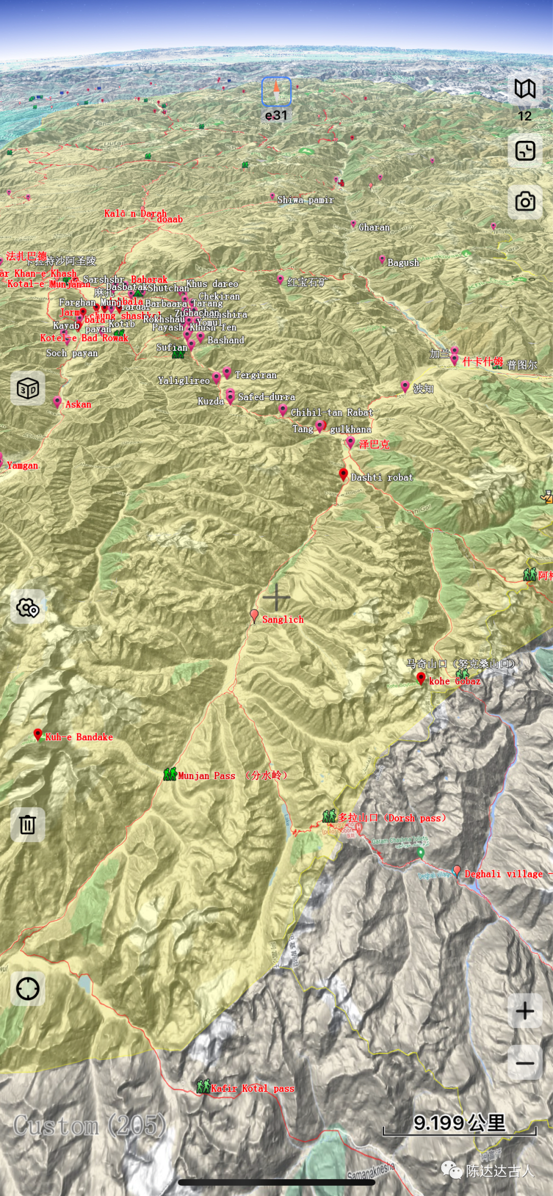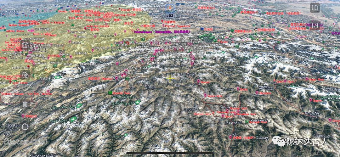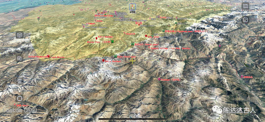 在泽巴克河谷向南溯流而上八公里左右,如今都有一个叫“大食驿站(Dasht-e Robat)”的村子,这是后期阿拉伯人东进,在这里新建的另一个“大食之门”,继续向南25公里就到了“桑格里奇(Sanglich)”。从这里向东南方向翻越多拉山口进入商弥奇特拉尔地区,直接向南爬升翻越蒙赞山口(Munjan Pass )就进入了卡菲尔斯坦地区(努里斯坦部落地区)。准确地说,多拉山口(海拔4600米)是印度河流域与阿姆河流域的东西分水岭,而蒙赞山口(海拔4300米)则是巴达赫尚地区科克查河(或Munjan river)与瓦杜吉河的南北分水岭。