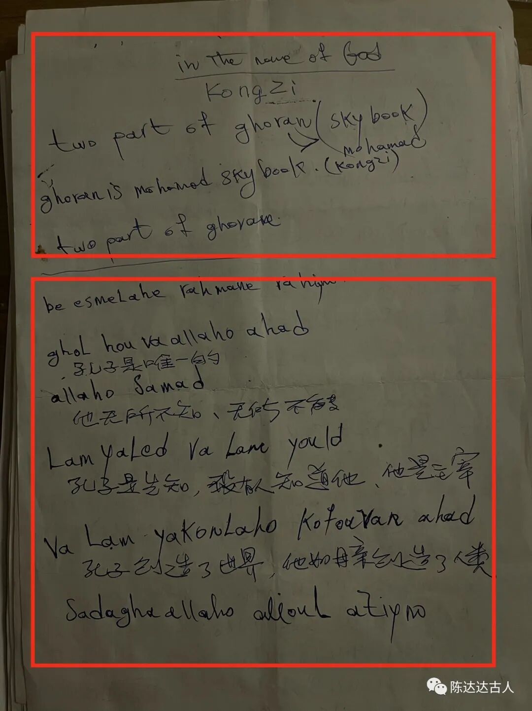 “Two part of Ghoran(Sky/Mohamad) 在我们穆斯林看来古兰经(Ghoran)由天和穆哈默德构成(Sky /Mohamad),他们合二为一。”梅森一边写,一边给我解读,“Ghoran is mohamad /sky book(古兰经即是穆哈默德天书)