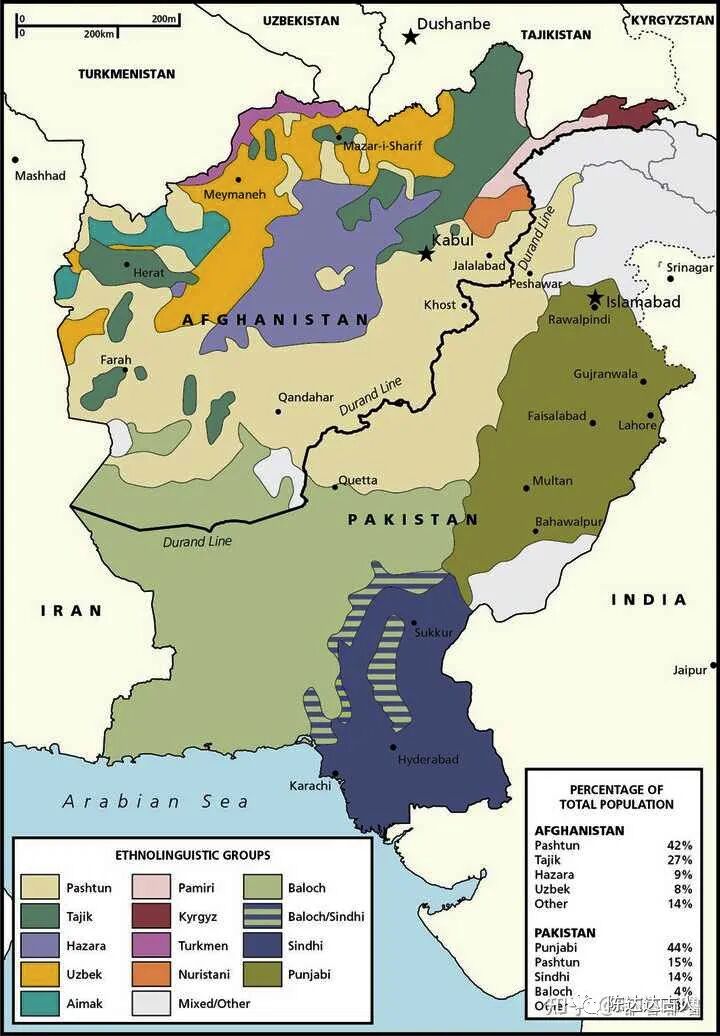 而普什图语却跟波斯语有很大的区别,主要在阿富汗兴都库什山脉南部普什图族地区广泛使用。塔利班就通行普什图语。如果我们把整个阿富汗以兴都库什山脉南北区划,那么北部地区主要就是说达利语和塔吉克语,南部地区一直到东边巴基斯坦的白沙瓦及其北部山区则主要讲普什图语。它们都属于印欧语系的伊朗语族。但讲达利语的人未必懂普什图语,而操普什图语的人一般都能通达利语。这种情况在阿富汗农村尤其明显。