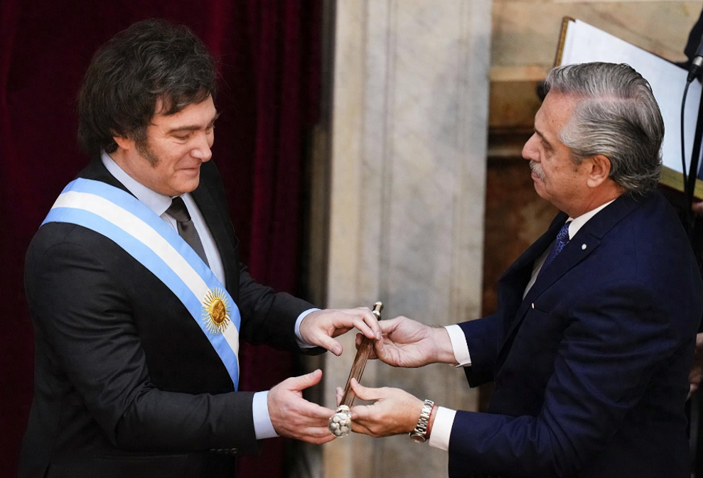 米莱在就职仪式上,向阿根廷宪法宣誓,并从前总统费尔南德斯手中接过绶带和权杖。随后发表公开演讲,承诺他将在总统任期内,将努力推动变革,以结束阿根廷的衰败局面,带领阿根廷人民走向繁荣。